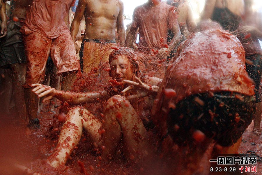 西班牙布尼奧爾小鎮(zhèn)舉行一年一度的西紅柿節(jié),成千上萬來自世界各地的人們慕名前往。圖為一名男子躺在西紅柿果漿中。