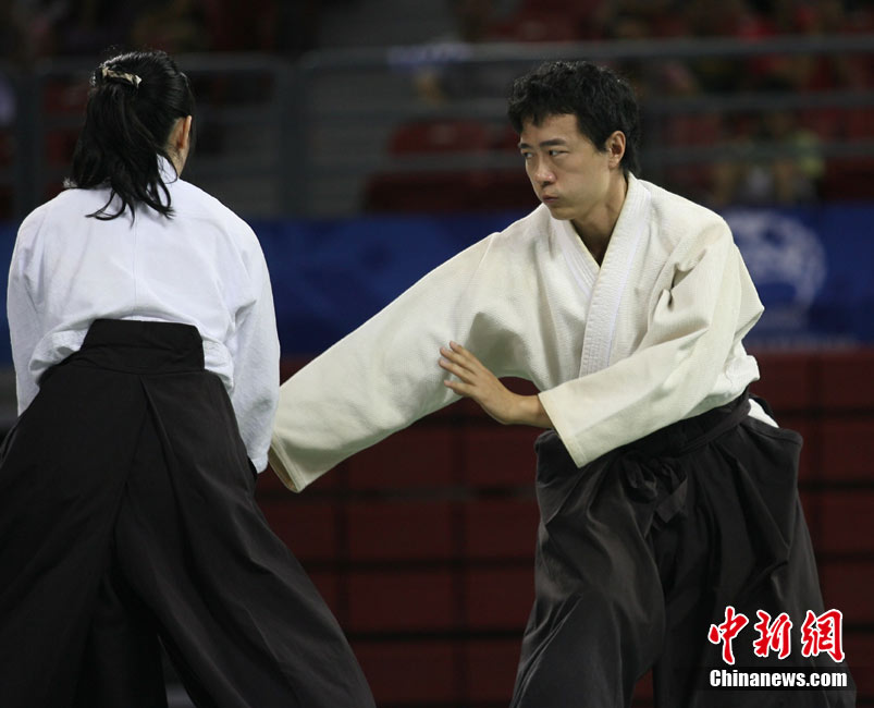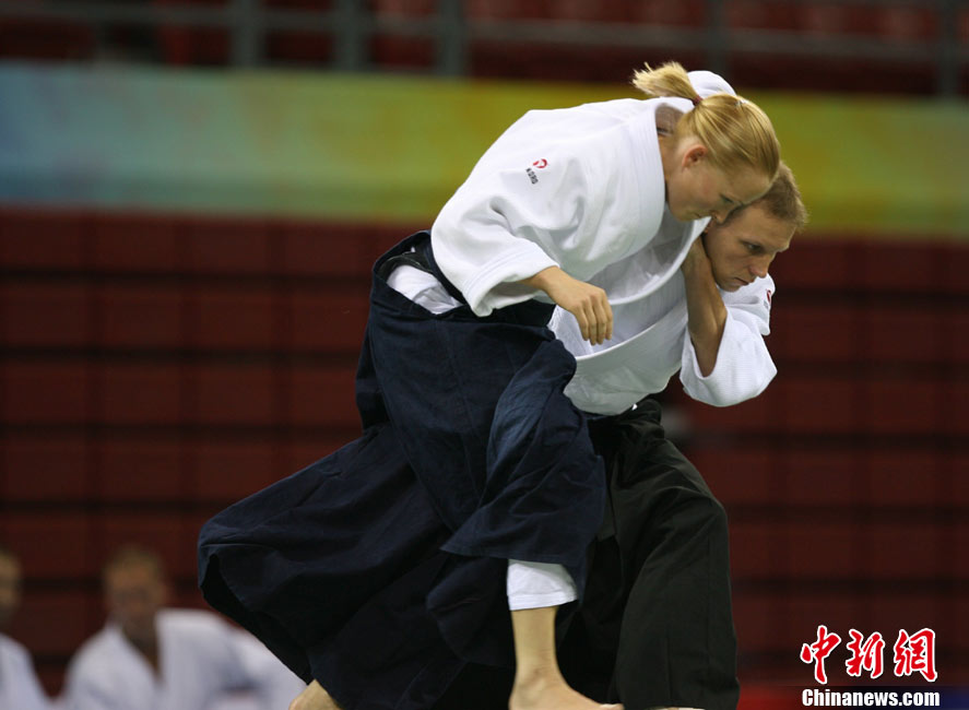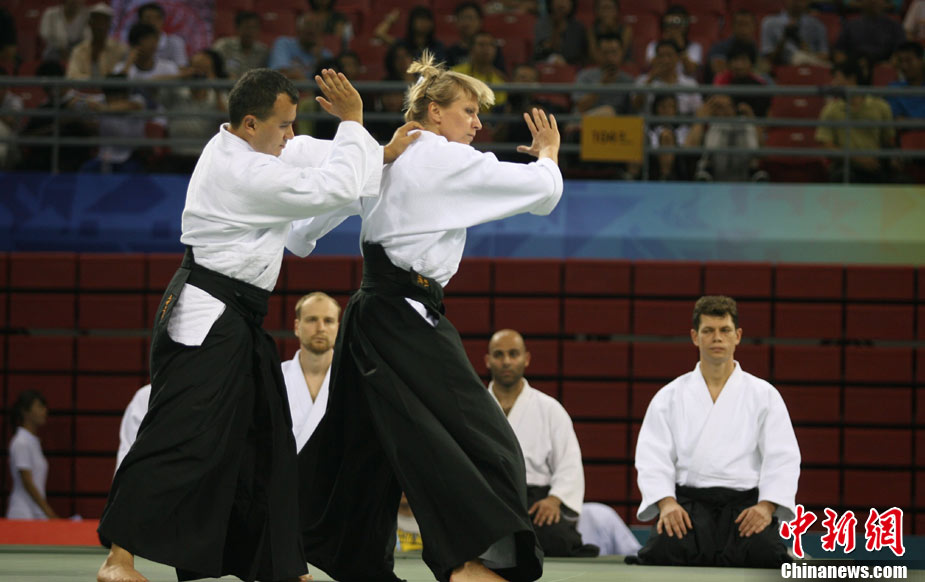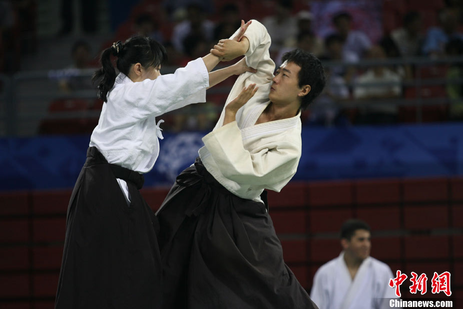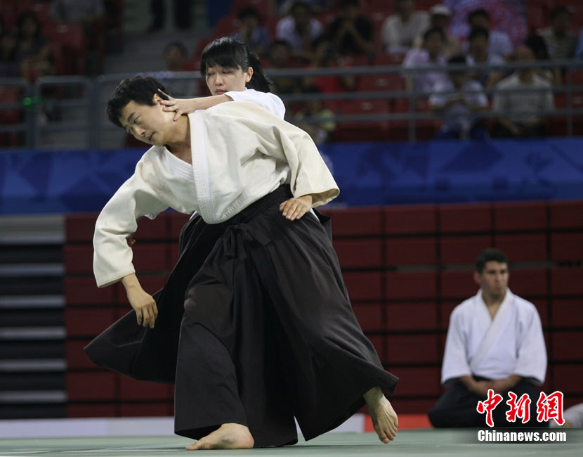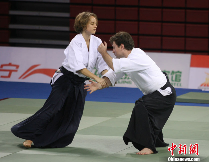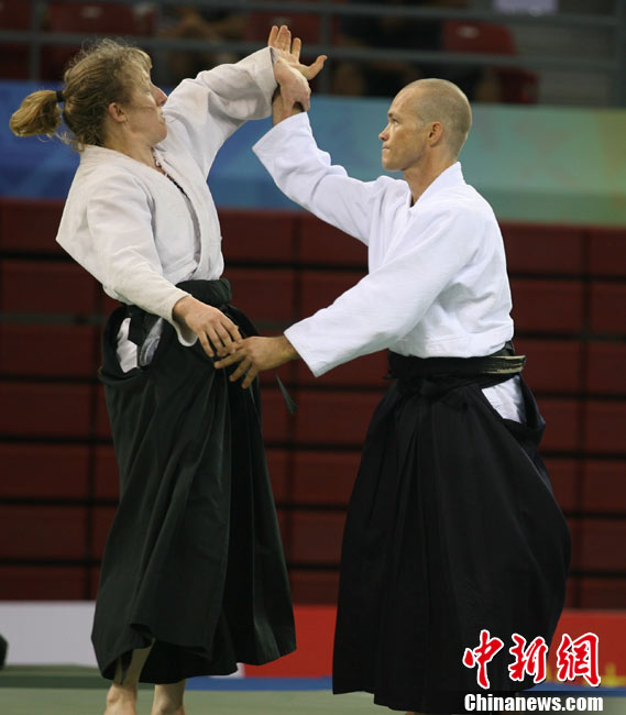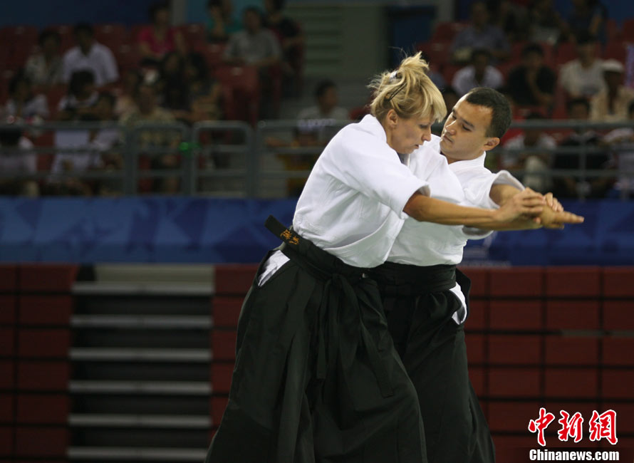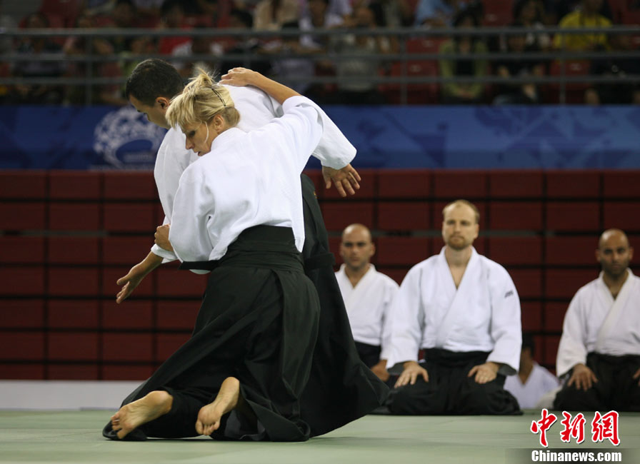 8月30日,男女選手在北京武搏會(huì)合氣道比賽上演了“異性對(duì)決”。合氣道是一種根源于日本大東流合氣柔術(shù)的近代武術(shù),合氣道不注重比賽的勝負(fù),沒有跟別人較量的思想,而是跟他人一起鍛煉和修養(yǎng)自己,因此才會(huì)有鮮見的異性同場對(duì)決的場面出現(xiàn)。本次武搏會(huì),合氣道將作為表演項(xiàng)目,無特別的規(guī)則,因此不能夠嚴(yán)格地定義勝利者或者失敗者。國際合氣道聯(lián)合會(huì)將組織高段教官來評(píng)判各項(xiàng)表演,表演賽分為基本技巧、高級(jí)技巧和復(fù)合技巧等三個(gè)單元。 中新社發(fā) 蘇丹 攝