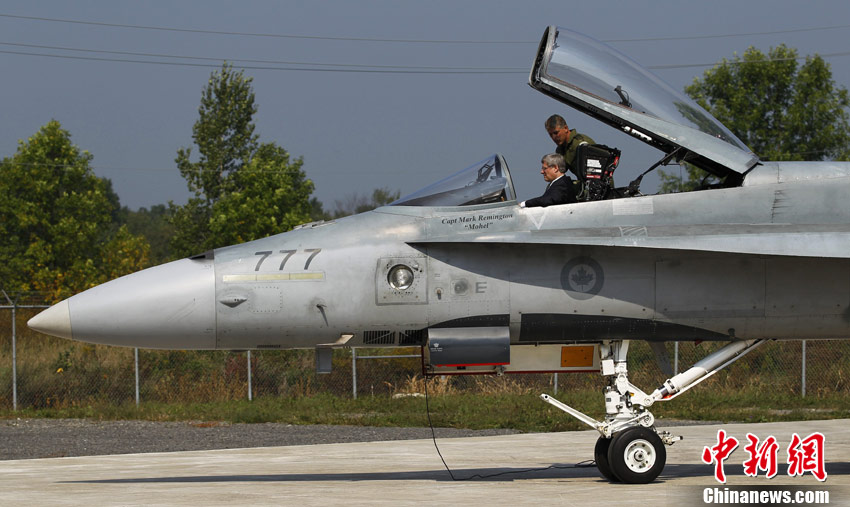 當(dāng)?shù)貢r(shí)間9月1日,加拿大米拉貝爾,加拿大總理哈珀參觀L-3通信公司,并坐進(jìn)一架CF-18“大黃蜂”戰(zhàn)斗機(jī)駕駛艙進(jìn)行體驗(yàn)。