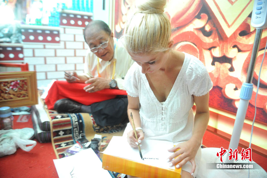 9月3日,上海世博會(huì)西藏活動(dòng)周進(jìn)入第3天。土耳其姑娘Esmeralda Sinani來到上海世博會(huì)寶鋼大舞臺(tái),體驗(yàn)藏族文化。圖為Esmeralda Sinani在喝酥油茶,并向藏族人吉吉了解酥油茶相關(guān)的文化。 中新社記者 蔣雪林 攝
