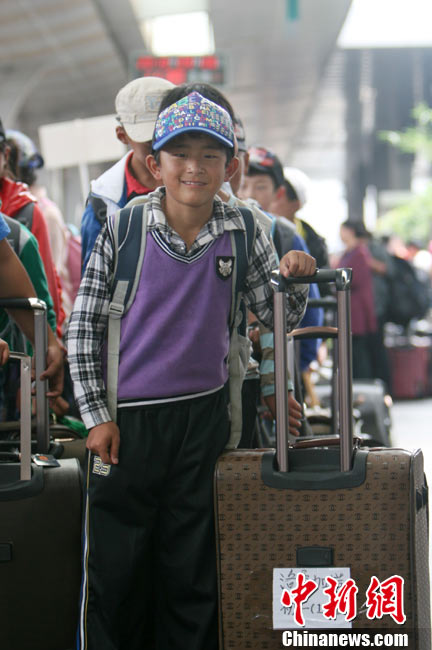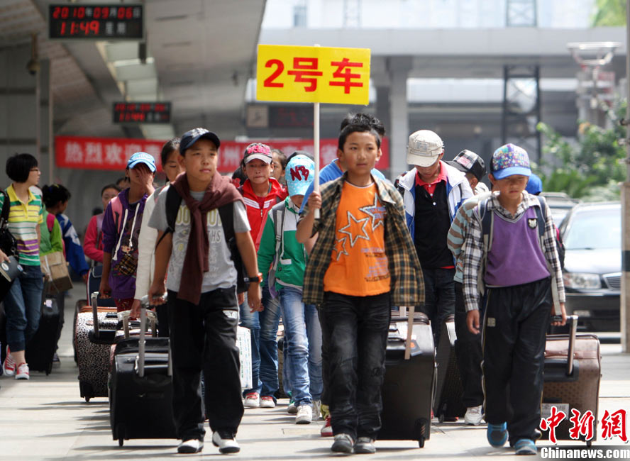 9月6日中午,青海省玉樹州地震災(zāi)區(qū)民族中學(xué)2013級(jí)初一、高一486名新生經(jīng)過長途跋涉安全抵達(dá)成都,他們將在四川都江堰八一聚源中學(xué)異地過渡。至此,玉樹州民族中學(xué)成建制轉(zhuǎn)移安置工作全部結(jié)束。圖為玉樹州民族中學(xué)新生抵達(dá)成都火車站。 中新社發(fā) 劉忠俊 攝
