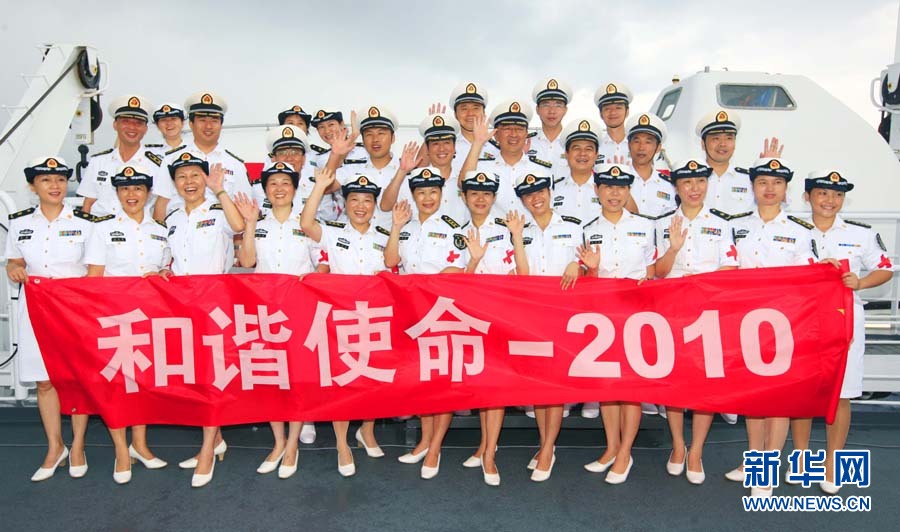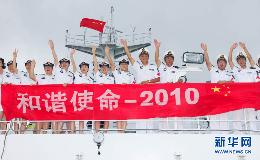 9月6日,“和平方舟”號(hào)醫(yī)院船舉行宣誓儀式。當(dāng)日,經(jīng)過連續(xù)多天的航行,前往亞丁灣海域及吉布提等亞非五國執(zhí)行“和諧使命—2010”任務(wù)的中國“和平方舟”號(hào)醫(yī)院船駛出國門。這是“和平方舟”號(hào)醫(yī)院船首次穿越南海駛向大洋。428名官兵及醫(yī)務(wù)人員全程參加這次為期87天的任務(wù),總航程將達(dá)1.5萬多海里。自8月31日駛離舟山碼頭后,醫(yī)院船經(jīng)受了“獅子山”“圓規(guī)”“南川”臺(tái)風(fēng)的考驗(yàn),穿越臺(tái)灣海峽、西沙群島和南沙群島,順利抵達(dá)南海。查春明 攝 圖片來源:新華網(wǎng)