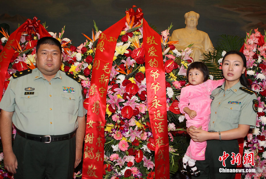 9月9日是毛澤東逝世34周年紀念日。當日上午,毛澤東的孫子、剛剛晉升為解放軍少將的毛新宇與夫人劉濱,帶著兩歲的女兒毛甜懿到位于北京天安門廣場的毛主席紀念堂敬獻鮮花。中新社記者 任晨鳴 攝