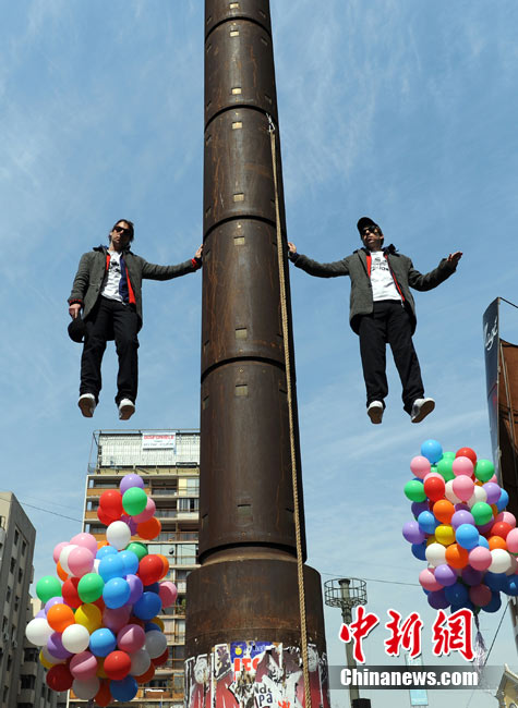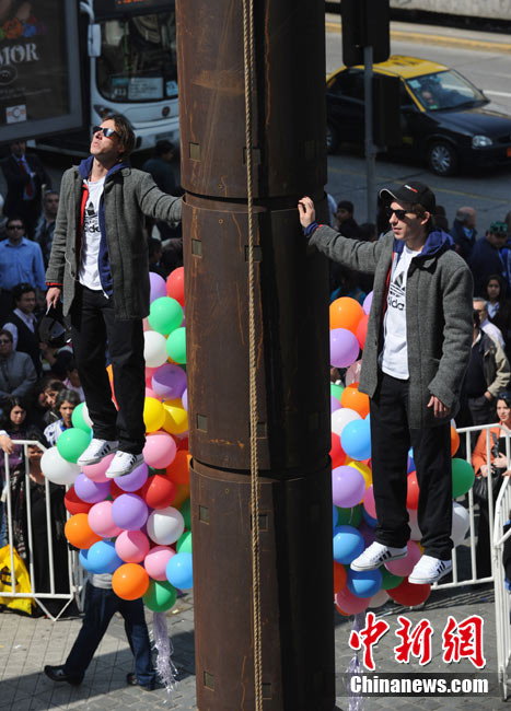 9月9日,智利著名的“魔術(shù)二人組”魔術(shù)師Jean Paul Olaverry和Nicolas Luisetti,在首都圣地亞哥街頭進(jìn)行空中漂浮魔術(shù)。他們將在空中漂浮200分鐘以此來慶祝智利獨(dú)立200周年。