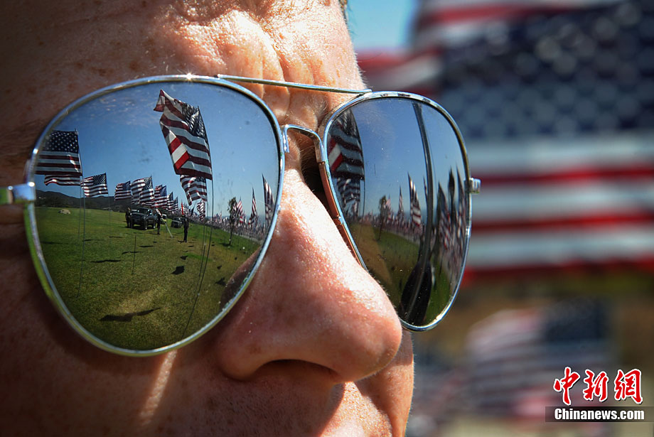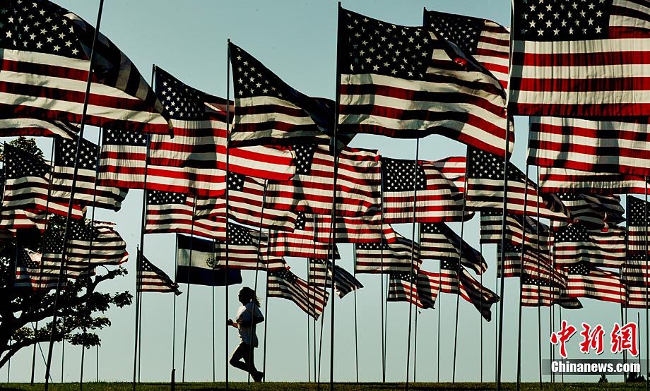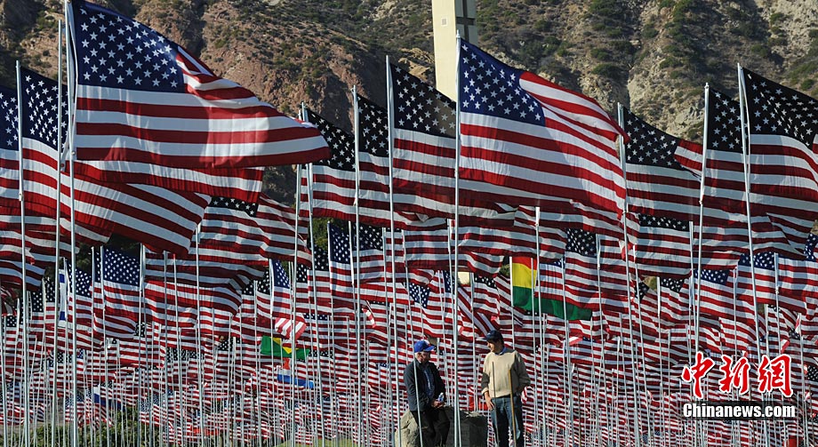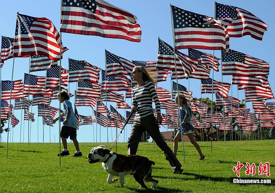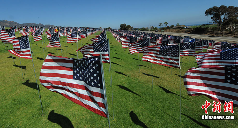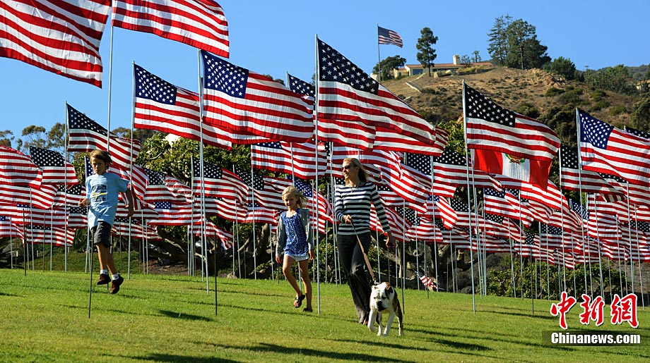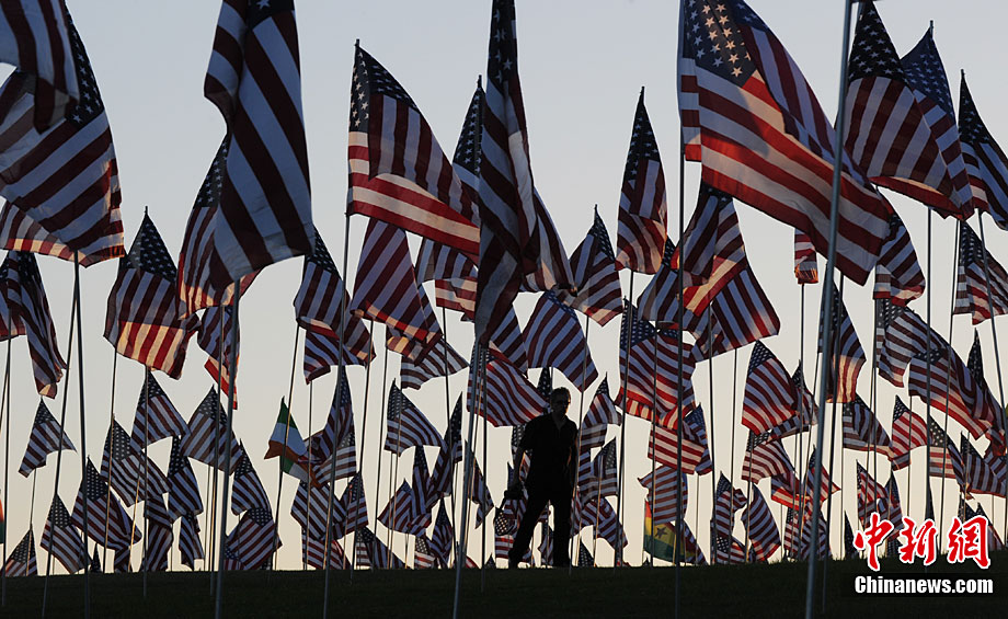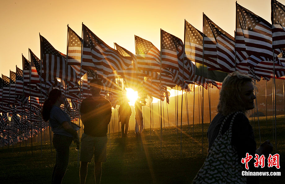 當(dāng)?shù)貢r間9月10日,在美國加利福尼亞州的馬里布,一些大學(xué)生在馬里布佩珀代恩大學(xué)的草坪上插上近3000面美國國旗和其它國家和地區(qū)的旗幟,紀(jì)念“9·11”恐怖襲擊事件的遇難者。