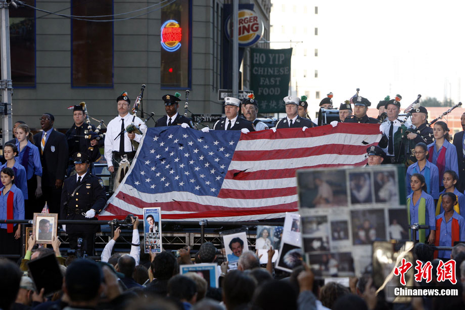 紐約世貿(mào)遺址當(dāng)?shù)貢r(shí)間9月11日上午舉行“9·11”事件9周年紀(jì)念活動(dòng),一面“9·11”事件中殘留下來(lái)的美國(guó)國(guó)旗在活動(dòng)中展示。中新社記者 孫宇挺 攝