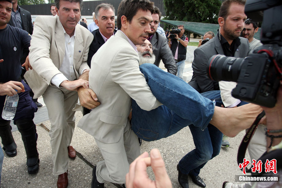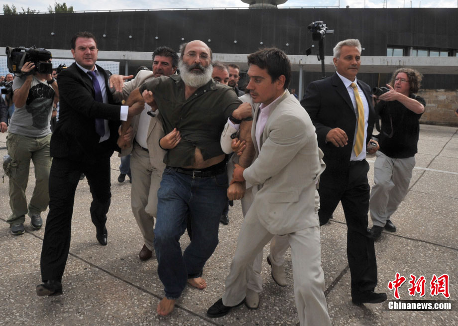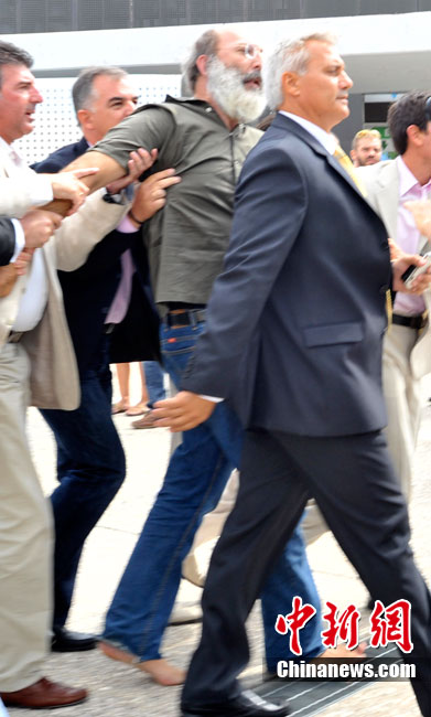 當(dāng)?shù)貢r(shí)間9月11日,在希臘北部城市塞薩洛尼基,希臘總理帕潘德里歐參觀塞薩洛尼基國(guó)際博覽會(huì)時(shí)遭一男子擲鞋襲擊,但沒(méi)有被鞋擊中。
