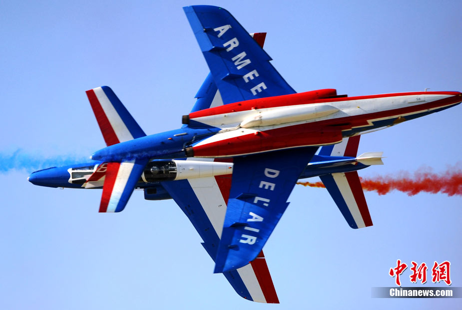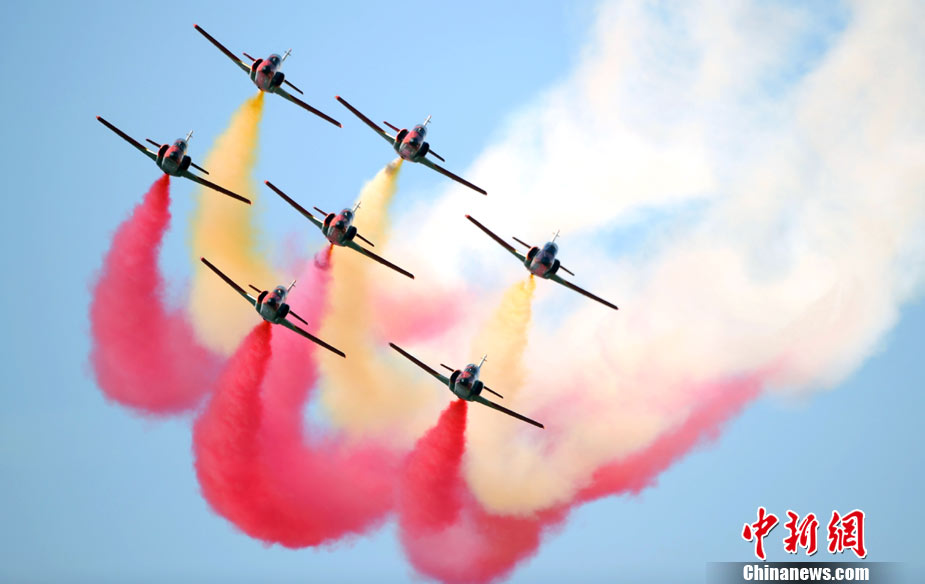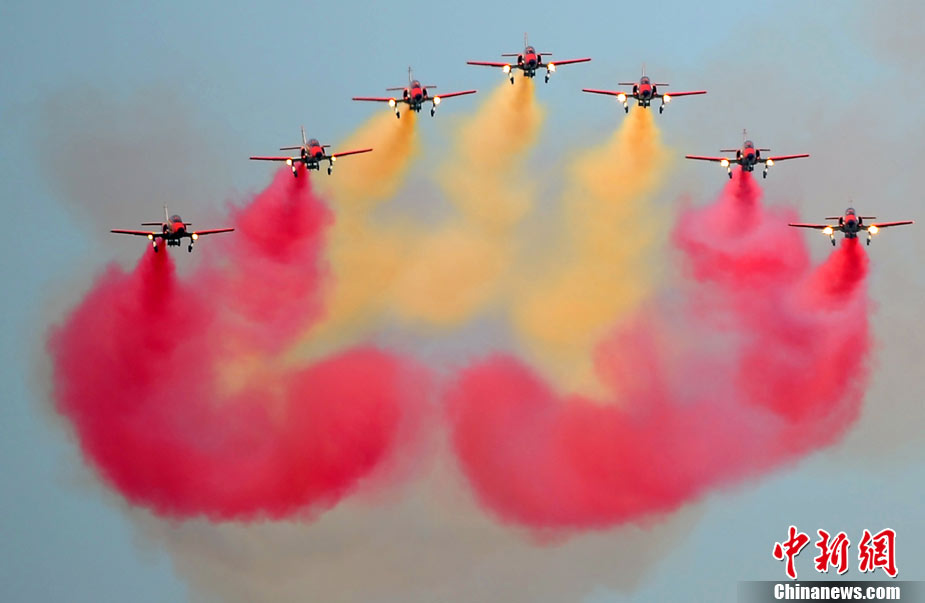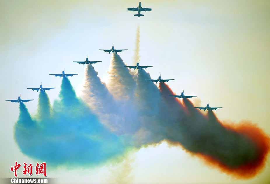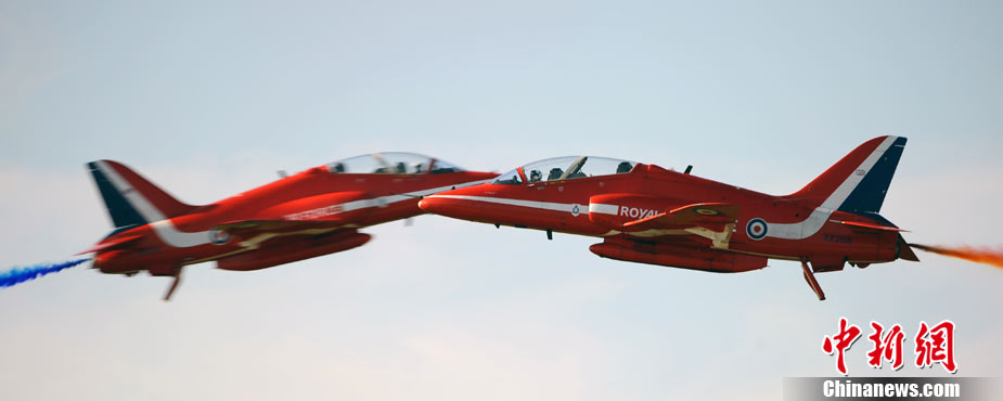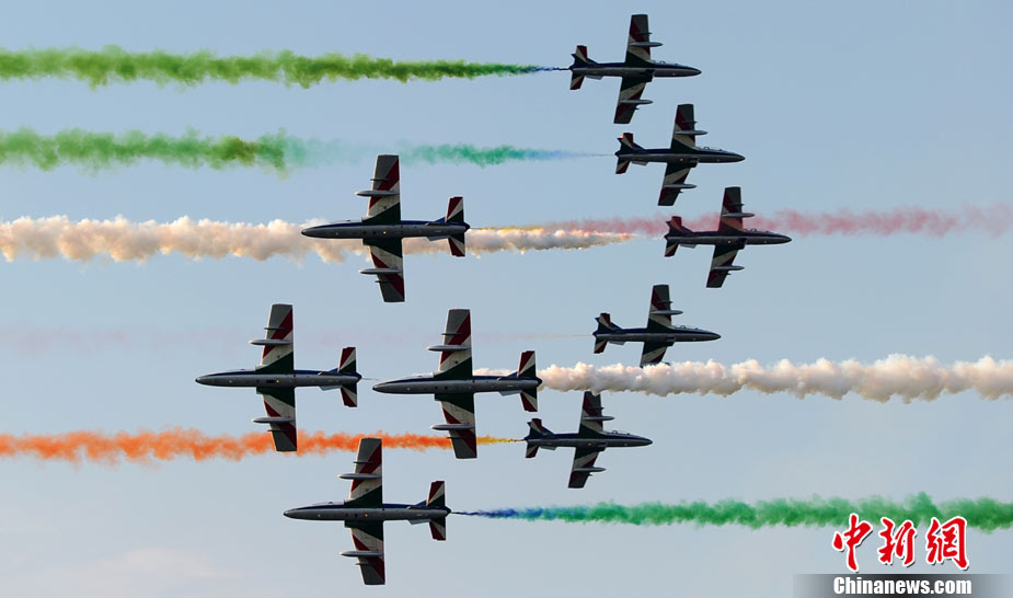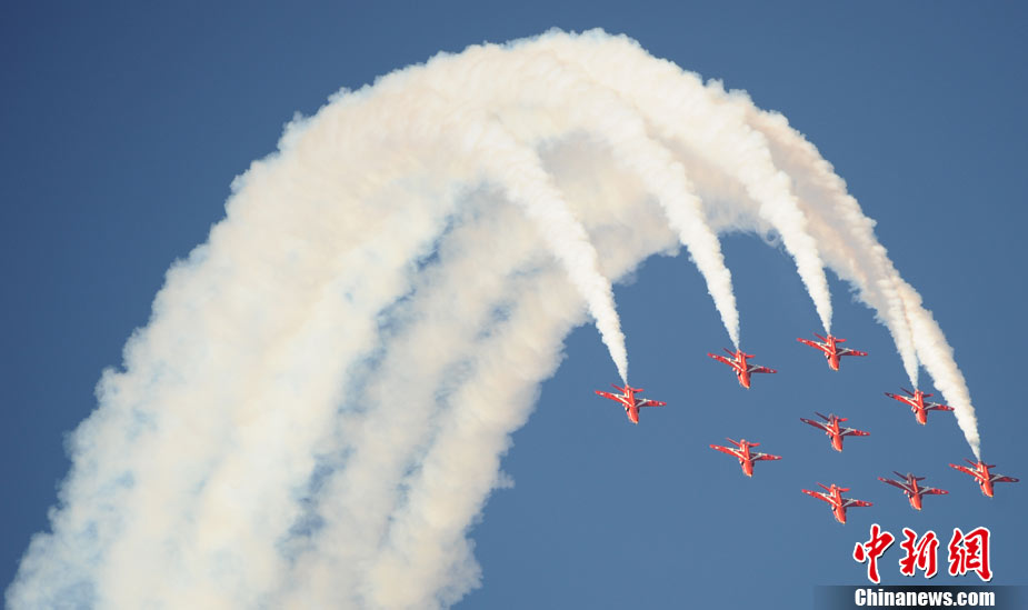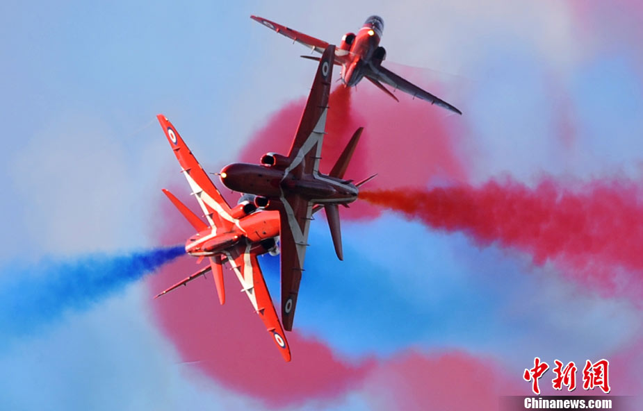 9月12日,為了慶祝意大利“三色箭”特技飛行表演隊(duì)成立50周年,多國飛行表演隊(duì)“齊聚”意大利,在Rivolto軍事基地進(jìn)行了精彩的空中特技表演。圖為英國”紅箭“飛行表演隊(duì)進(jìn)行特技表演。