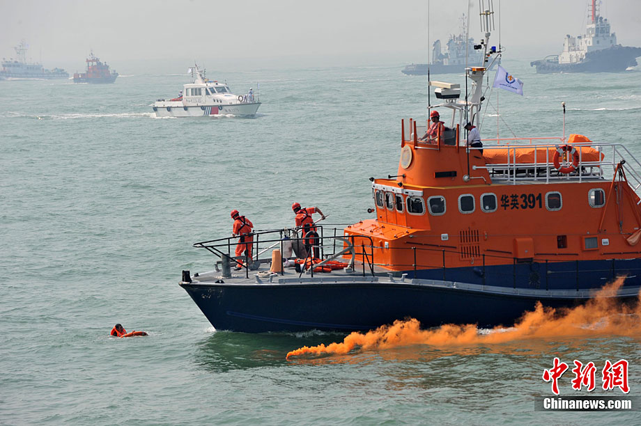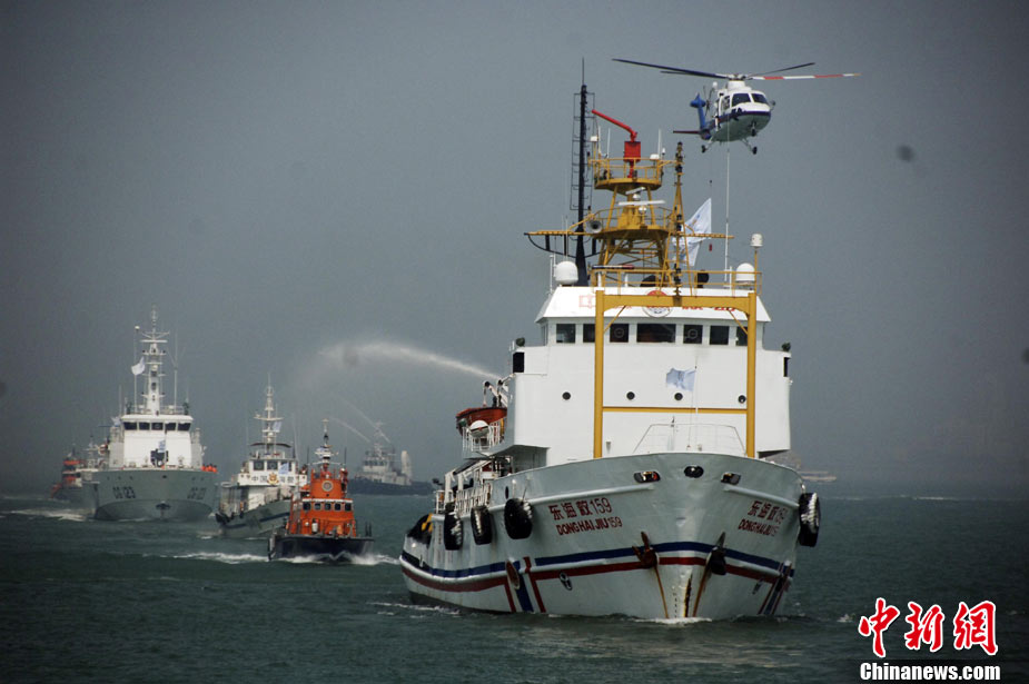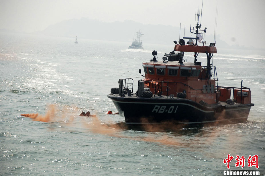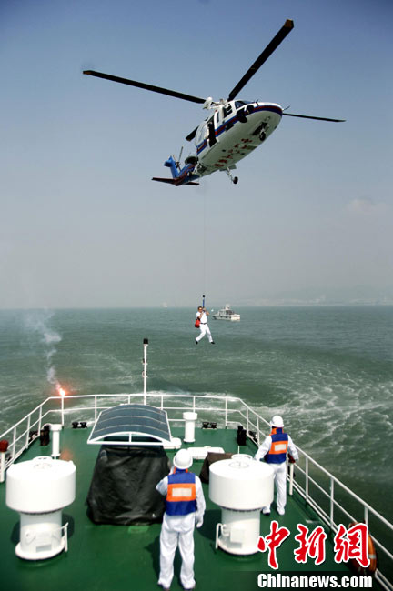 9月16日上午,2010年海峽兩岸海上聯(lián)合搜救演練在臺(tái)灣海峽的廈門、金門附近海域舉行。海峽兩岸海上搜救單位參演人數(shù)400多人,共動(dòng)用搜救船舶14艘、救助飛機(jī)3架。其中大陸方面主要參演船舶9艘、救助直升機(jī)2架;臺(tái)灣方面主要參演船舶5艘、救助直升機(jī)1架。這是自2008年12月15日兩岸海上直航正式啟動(dòng)以來(lái),海峽兩岸海上搜救力量首次共同進(jìn)行的大規(guī)模海陸空聯(lián)合搜救演練。圖為演練現(xiàn)場(chǎng)。中新社發(fā) 王東明 攝