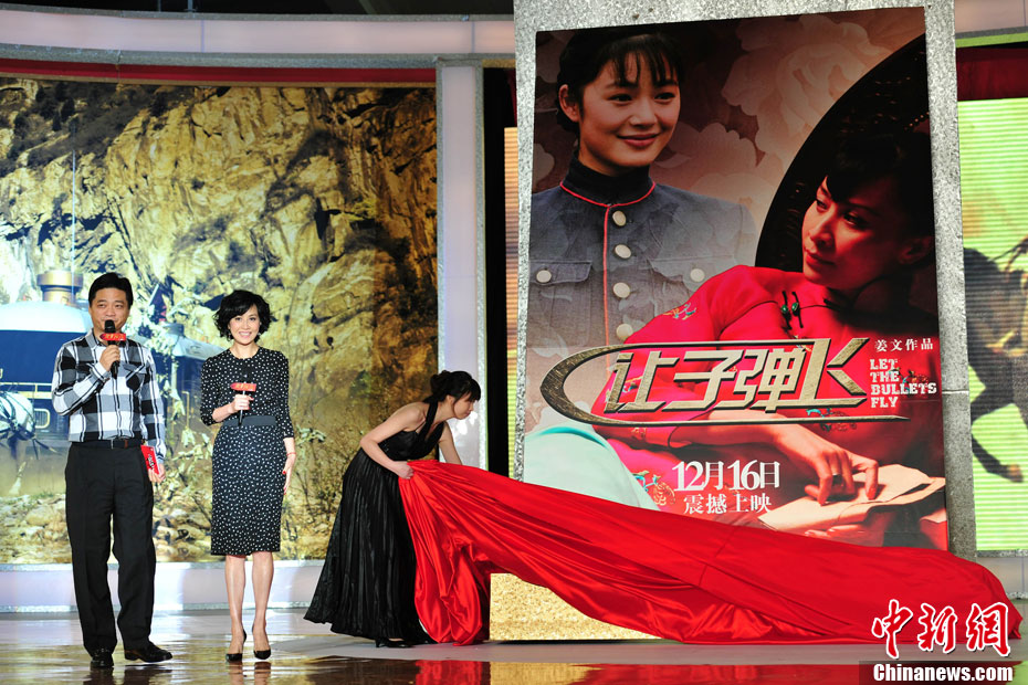 9月16日,將于12月26日震撼上映的電影《讓子彈飛》導(dǎo)演姜文攜主演劉嘉玲、廖凡、邵兵亮相北京,為即將上映的新作站臺宣傳。當(dāng)回答“票房預(yù)期”時,姜文自信的表示“我們這個戲里有葛優(yōu),有周潤發(fā),以前別人說一個電影‘不優(yōu)不發(fā)’或者說‘不發(fā)不優(yōu)’。那我們這個片子里又有(葛)優(yōu)又有(周潤)發(fā),我都不敢想能賣多少了。” 女主角劉嘉玲在片中“情挑”姜文、周潤發(fā)、葛優(yōu)三影帝。她更是對《讓子彈飛》成為今年內(nèi)地票房冠軍充滿信心,表示假如梁朝偉《一代宗師》趕上賀歲檔,樂意打敗他們。