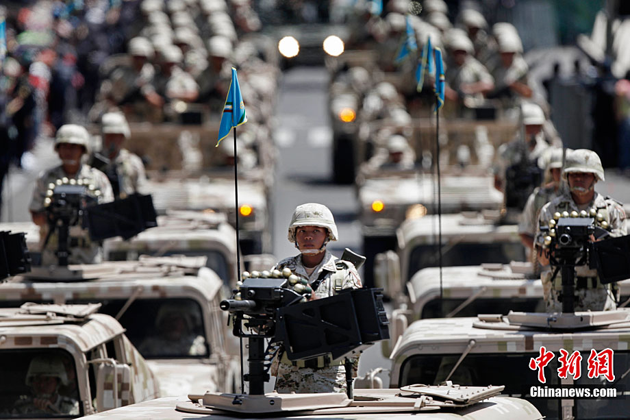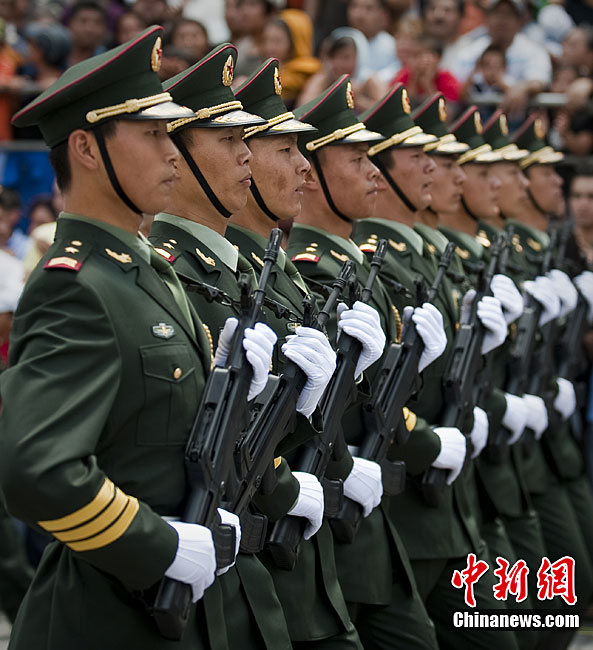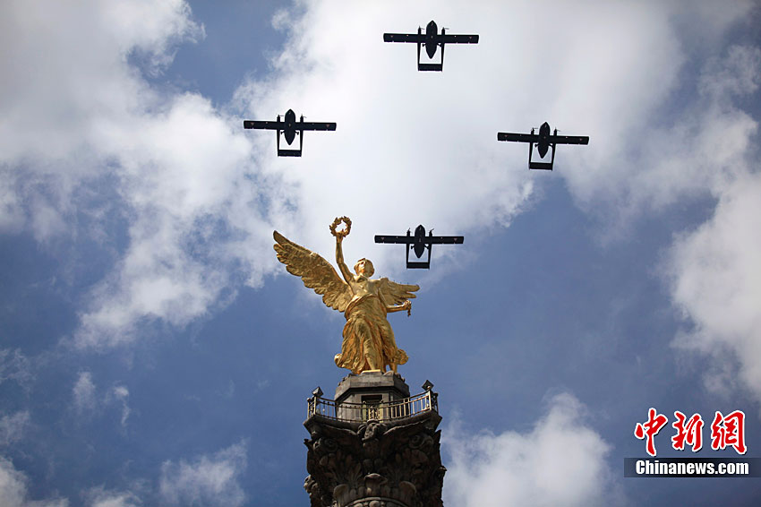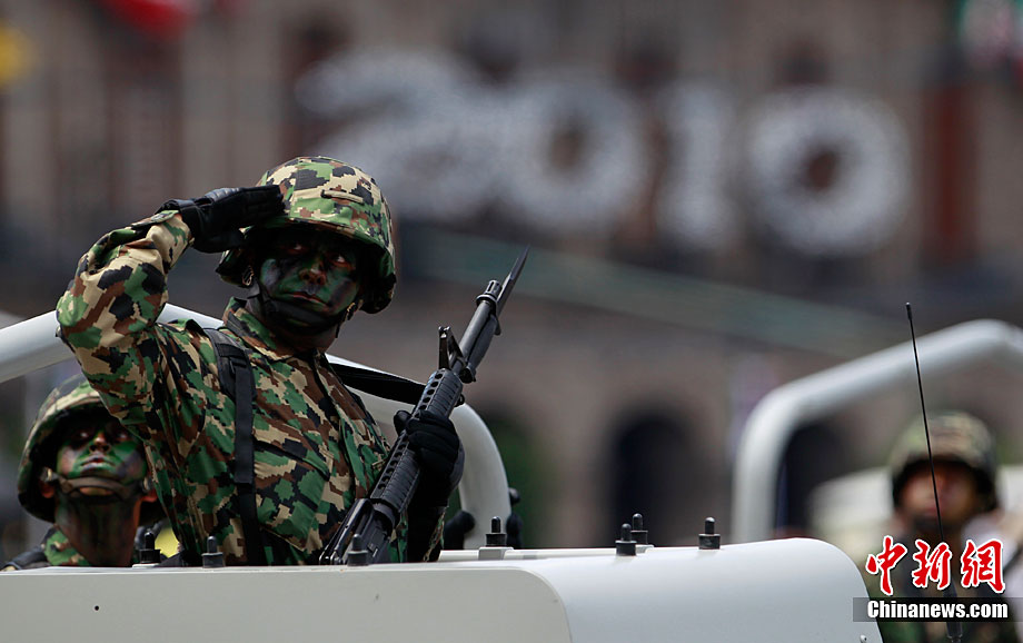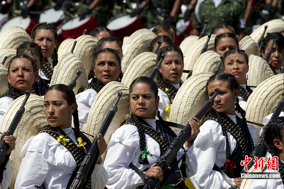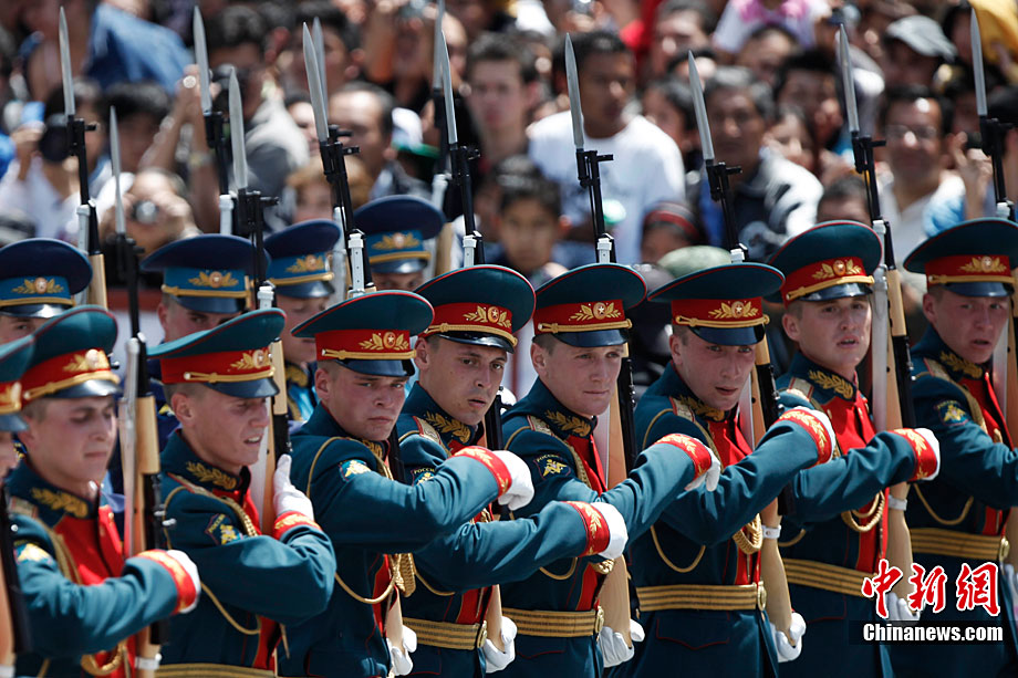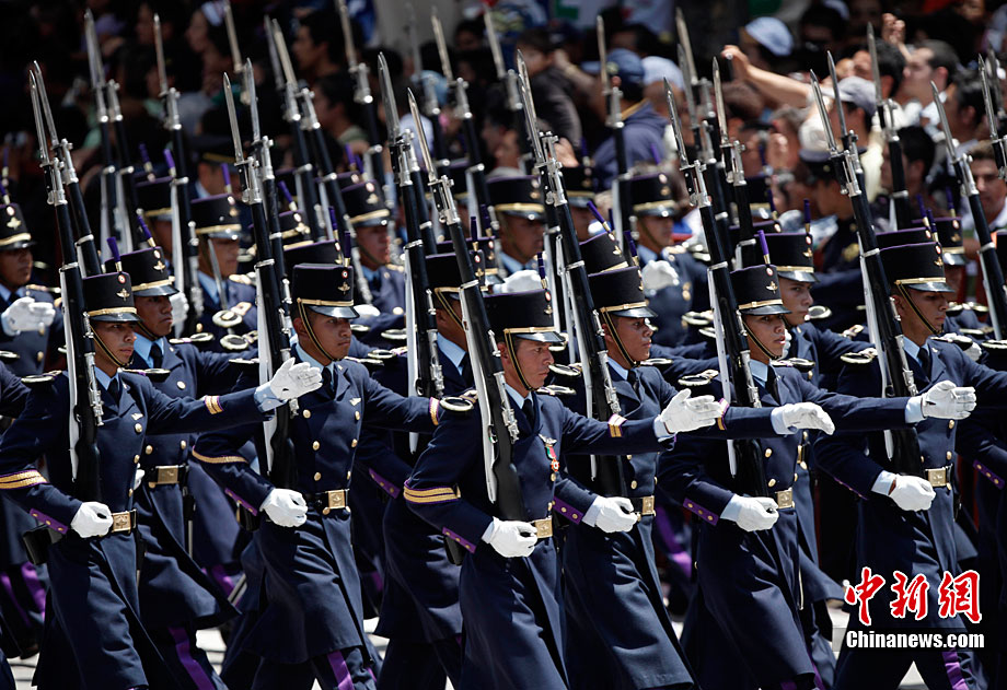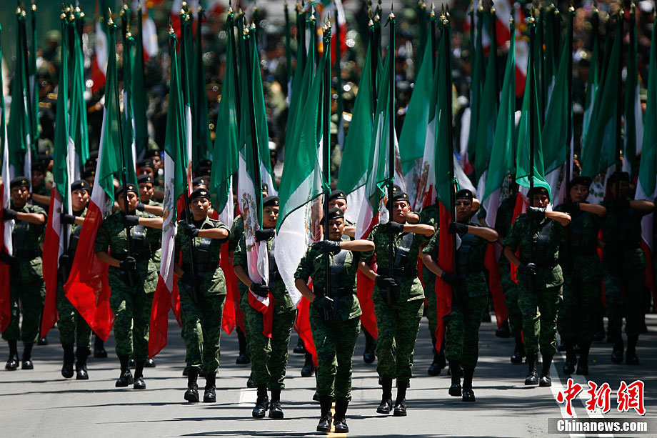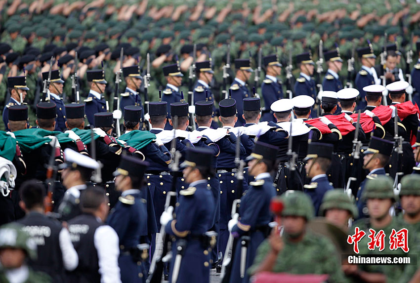 9月16日,在墨西哥首都墨西哥城,中國人民解放軍儀仗方隊參加墨西哥獨立200周年慶典閱兵。參加此次閱兵的中國儀仗隊由36人組成,其中34人編成方陣,最前方是1名旗手、5名護旗手,后隨1名陸軍指揮官,其身后列3隊,陸?崭1列、每列9人。這是解放軍儀仗部隊首次走出國門遠赴海外參加活動。