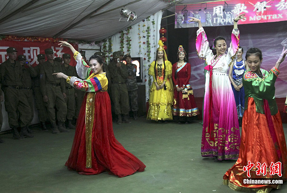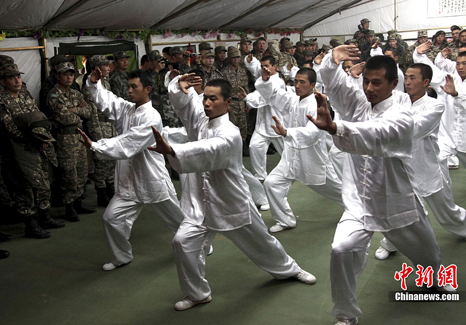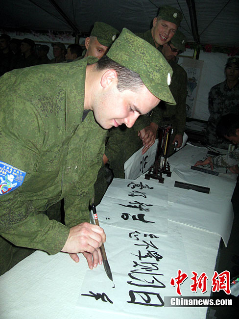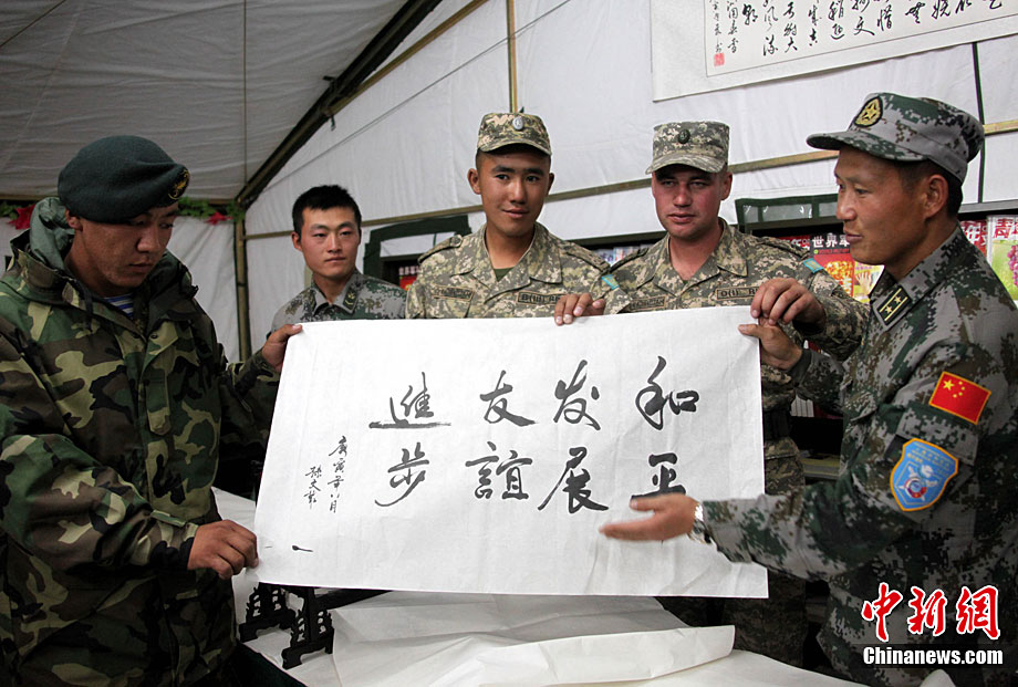 9月20日是“和平使命-2010”聯(lián)演確定的中國民族文化日,當(dāng)?shù)貢r(shí)間黃昏時(shí)分至晚上,哈薩克斯坦、俄羅斯、塔吉克斯坦、吉爾吉斯斯坦參演部隊(duì)官兵應(yīng)邀先后來到中方野戰(zhàn)兵營(yíng)內(nèi)的“民族文化屋”帳蓬,觀賞、體驗(yàn)博大精深的中國文化。圖為中方參演官兵現(xiàn)場(chǎng)揮毫并將書法作品贈(zèng)送給哈方官兵。中新社記者 孫自法 攝