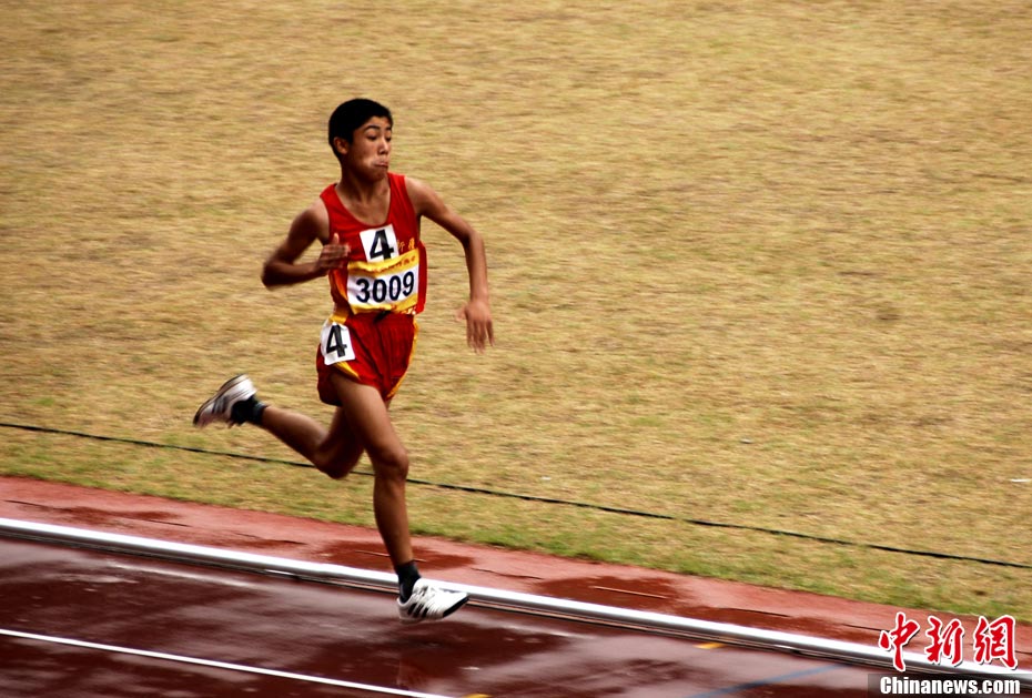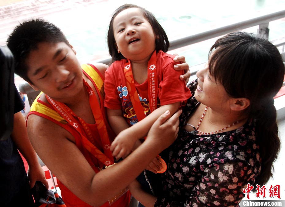 安徽特奧健兒何恩澤奪冠后與前來為他加油的媽媽和妹妹幸福相擁。王東明 攝