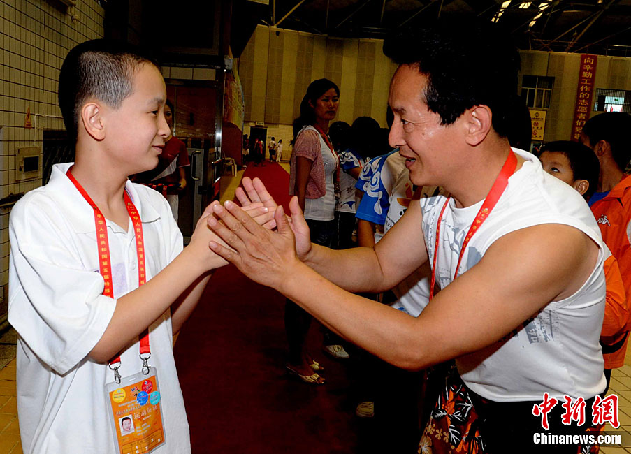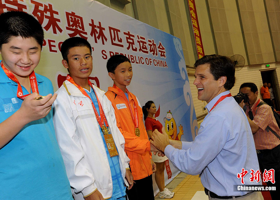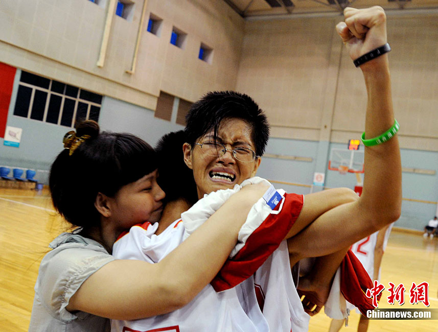 9月24日,在本屆特奧運(yùn)動(dòng)會(huì)男子籃球C組決賽中,福建一團(tuán)力克對(duì)手獲得冠軍。圖為比賽結(jié)束后福建一團(tuán)特奧籃球運(yùn)動(dòng)員張華閩、張華粵雙胞胎兄弟與一旁觀賽的母親唐秀玲相擁而泣,場面感人。劉可耕 攝