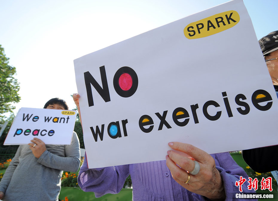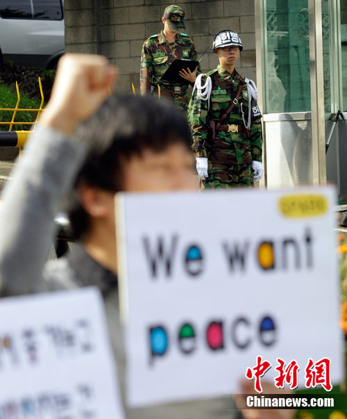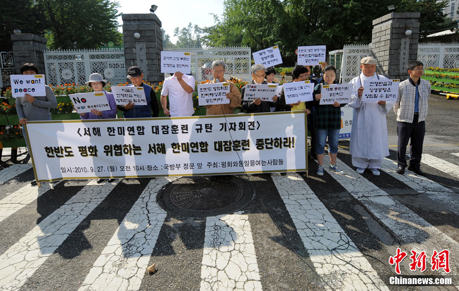 韓美反潛聯(lián)合軍事演習(xí)27日在韓國(guó)西部海域(黃海)拉開帷幕。當(dāng)日,一些韓國(guó)反戰(zhàn)人士在國(guó)防部門前集會(huì)抗議美韓聯(lián)合軍演。