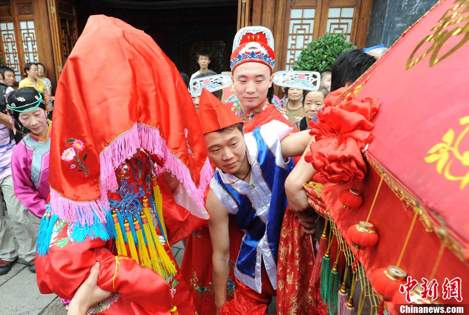10月1日國慶節(jié),福州古街上演一場傳統(tǒng)民俗婚禮令眾多游客爭睹。該傳統(tǒng)民俗婚禮分起轎、回車馬、迎轎、下轎、祭拜天地、入洞房等場面喜慶。