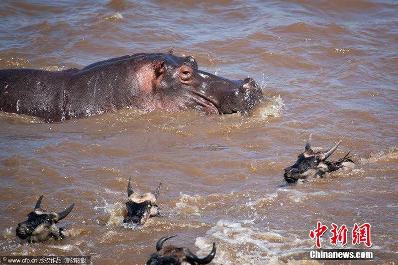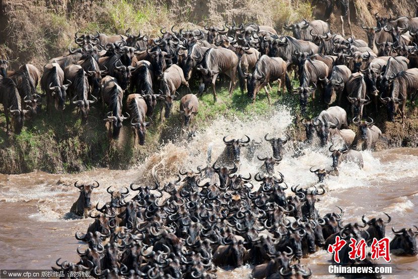 英國兄弟威廉和馬修·伯拉德-盧卡斯日前從倫敦前往非洲進(jìn)行了為期12天的探險(xiǎn)之旅,他們在塞倫蓋蒂國家公園和馬賽馬拉國家保護(hù)區(qū)之間的馬拉河畔拍到了230萬只牛羚大遷徙的壯觀景象。馬拉河是長途遷徙的牛羚要渡過的最后一條河,在這里,牛羚的兩大天敵都在等待著它們,一種是世上最大、最為兇殘的尼羅鱷,另一種則是被稱為“非洲河王”的河馬。它們潛伏在水中,等待著牛羚渡河時(shí)飽餐一頓。而且在這種時(shí)候,就連周圍草原里的獵豹等猛獸也會(huì)來分一杯羹。但每年春秋兩季,牛羚都會(huì)從這里涉水而過,遷徙到遠(yuǎn)方尋找水草豐美的“伊甸園”。 圖片來源:CFP視覺中國