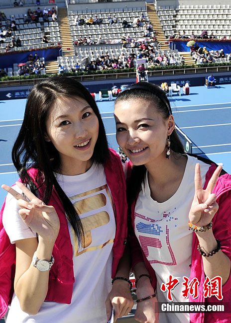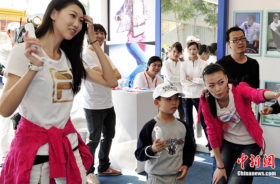 10月4日,時(shí)尚中網(wǎng)代言人、第五屆中國(guó)職業(yè)模特大賽冠軍趙晨池,首屆亞洲超級(jí)模特大賽冠軍王慧在北京亮相時(shí)尚運(yùn)動(dòng)品牌FILA展臺(tái),與現(xiàn)場(chǎng)的球迷朋友們開展了一場(chǎng)別開生面的網(wǎng)球游戲體驗(yàn)活動(dòng),助陣FILA及參與本屆中網(wǎng)的FILA四位代言人。中新社記者 錢興強(qiáng) 攝