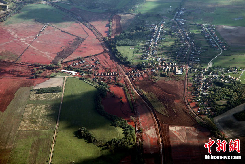 這張10月7日航拍的照片顯示,在匈牙利維斯普雷姆州奧伊考,鋁廠廢水池的堤壩毀壞,由此引發(fā)紅色有毒廢水泄漏。該鋁廠4日發(fā)生有毒廢水泄漏事故,目前已造成4人死亡,廢水7日上午流入多瑙河支流莫雄多瑙河。