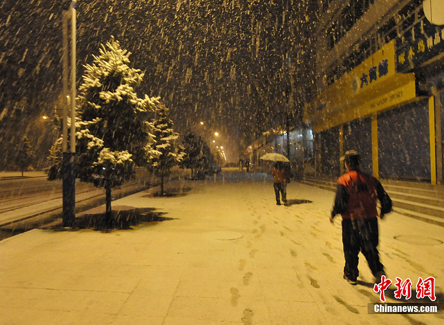 10月10日,行人冒雪在內(nèi)蒙古克什克騰旗經(jīng)棚鎮(zhèn)街頭上行走。當(dāng)日,受冷空氣影響,內(nèi)蒙古克什克騰旗普降大雪。孫國樹 攝 圖片來源:cnsphoto