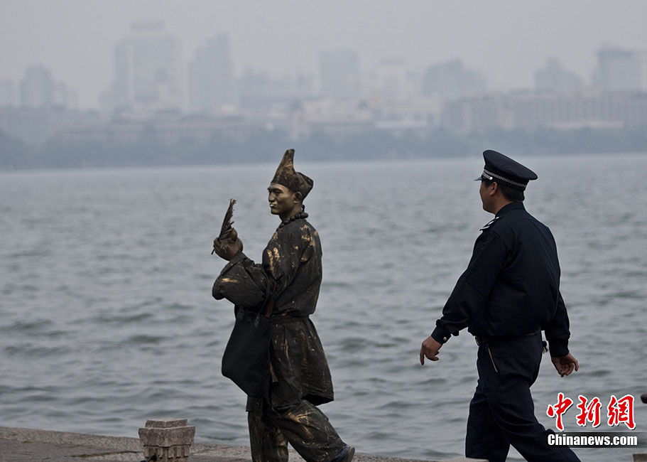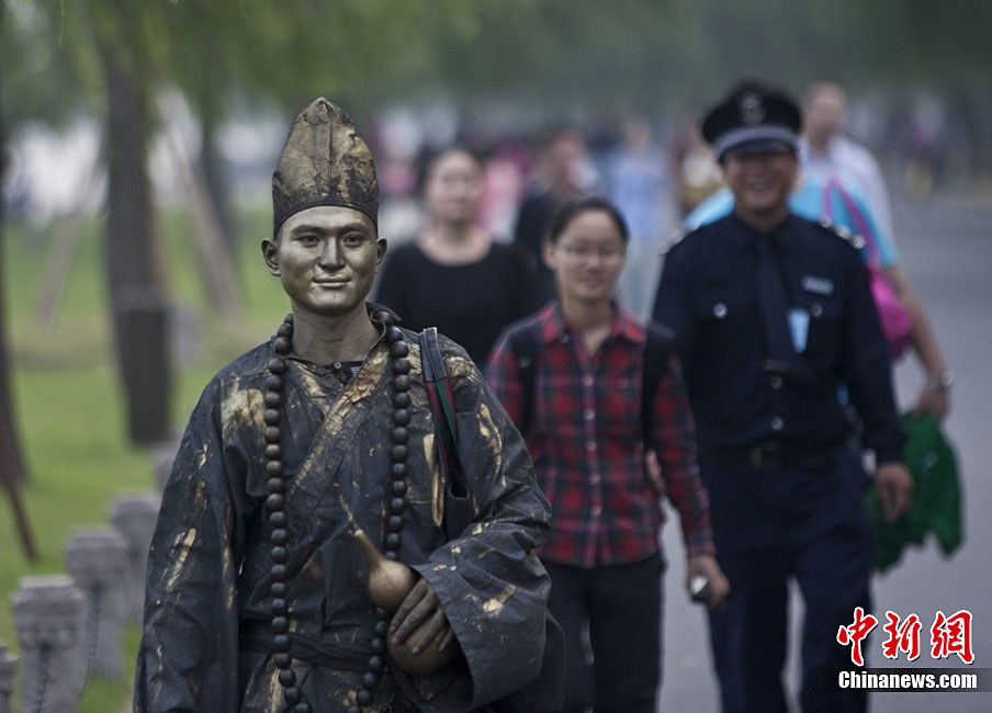 2010年10月上旬,一名打扮成濟公模樣的人在浙江省杭州市西湖白堤和游客合影,“濟公”身上涂滿了銅顏色的彩繪,看上去像雕塑一樣。據(jù)悉,這位20多歲“濟公”來自江蘇,從今年春天開始扮成“濟公”,在全國游走。和他合影需要交5元錢。許康平 攝 圖片來源:cnsphoto