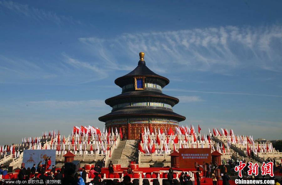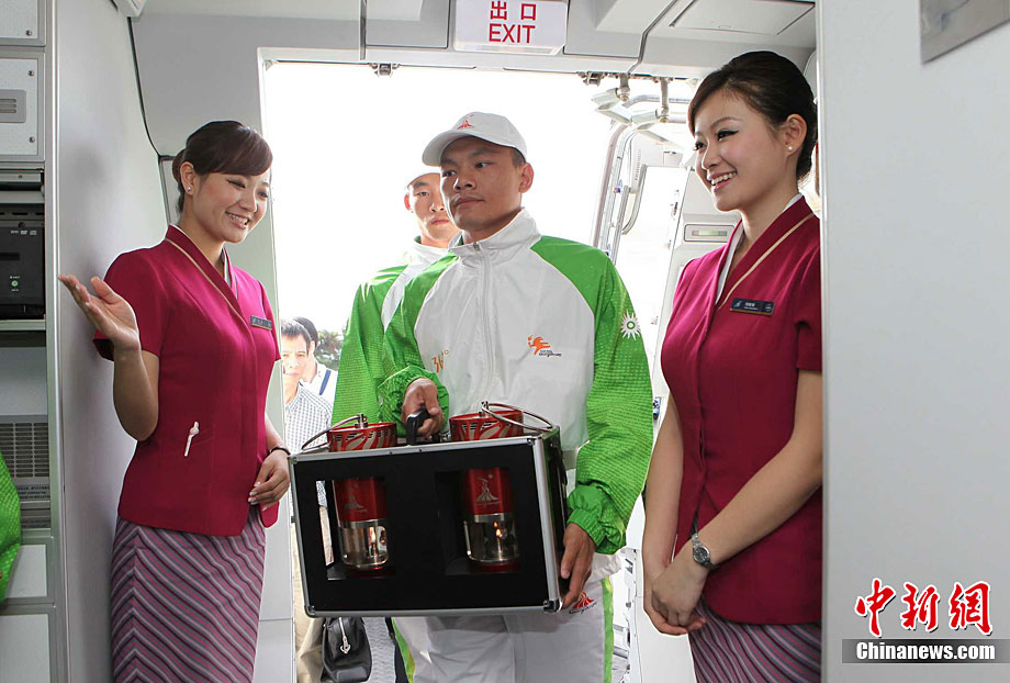 10月12日下午,第16屆亞運會圣火火種搭乘中國南方航空“亞運號”專機,從北京飛往亞運會舉辦城市廣州。中共中央政治局委員、廣東省省委書記汪洋、亞理奧事會及廣州亞組委官員、采火圣女、圣火護衛(wèi)等180多人同機抵達廣州。中新社發(fā) 羅廣泰 攝