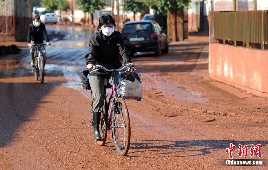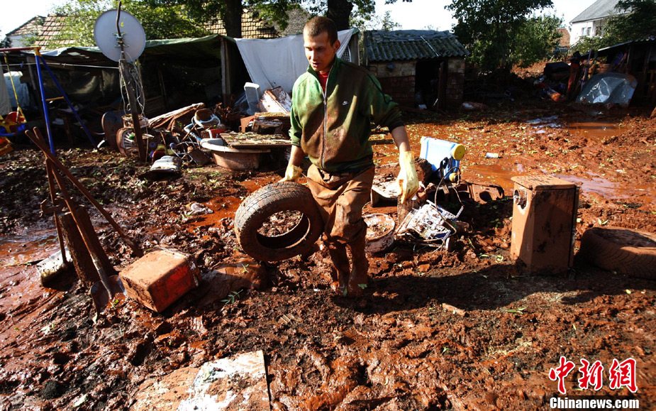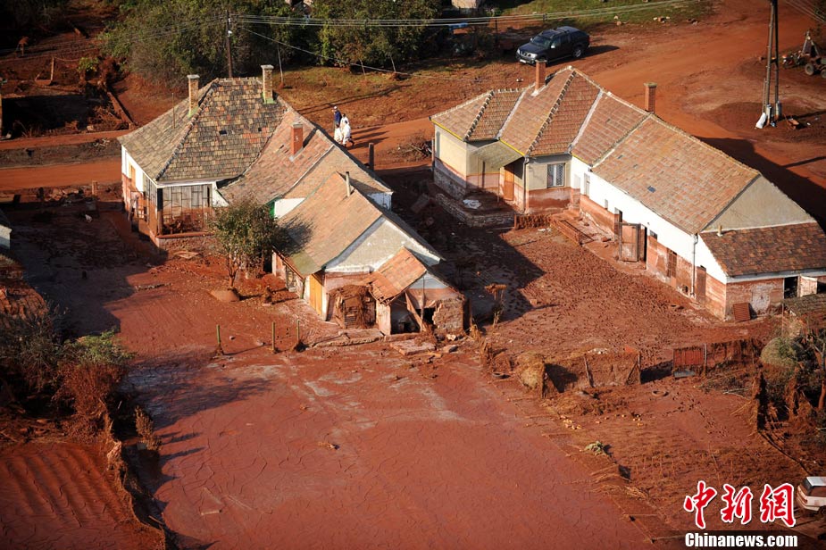 10月12日,匈牙利有毒廢料已擴(kuò)散到河道兩岸以及居民區(qū)。截至目前,基于 “二次泄漏”的威脅,污染最嚴(yán)重的科隆塔爾鎮(zhèn)中已有近1000人被迫離開自己的家園。圖為居民經(jīng)過被污染的路面。