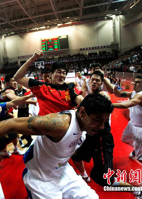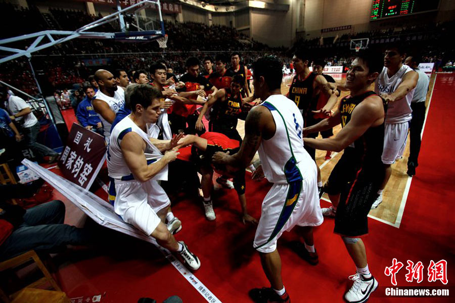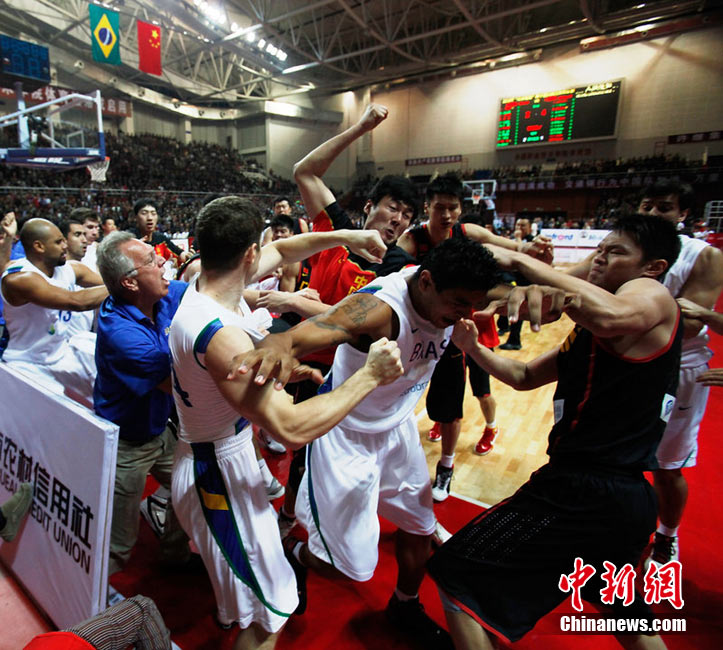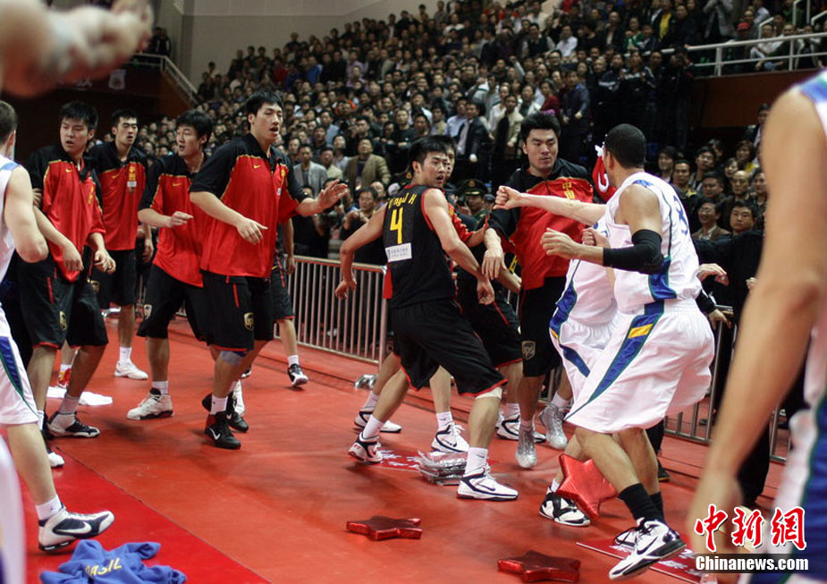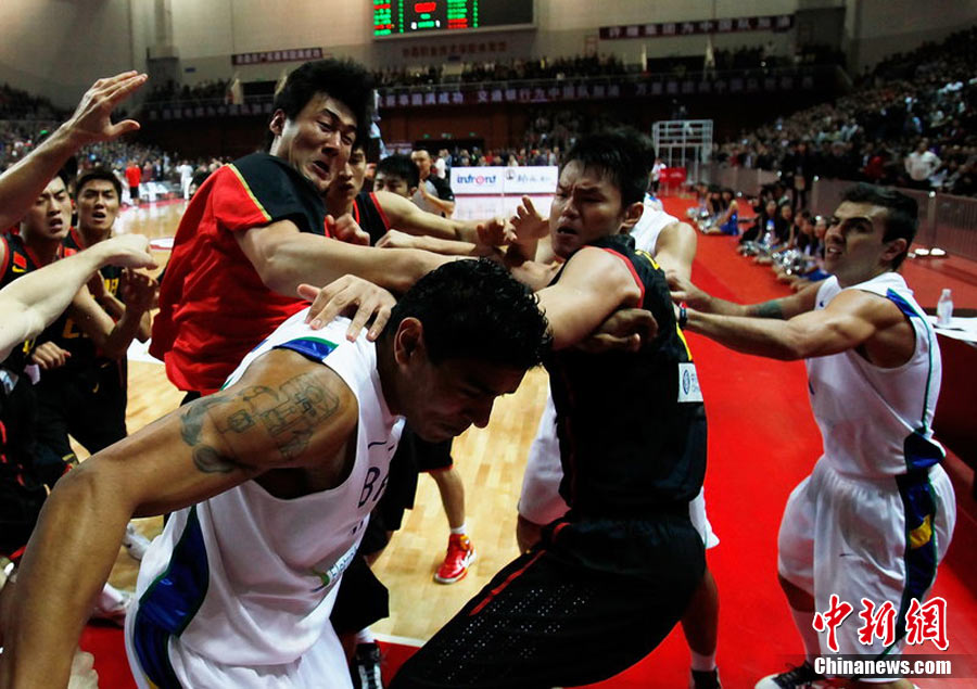 10月12日,河南許昌,2010男籃亞運(yùn)熱身賽第3場(chǎng),中國(guó)Vs巴西。雙方發(fā)生摩擦,爆發(fā)群毆。圖片來(lái)源:CFP視覺中國(guó)
