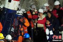 智利首名升井礦工弗洛倫西奧•阿瓦洛斯(Florencio Avalos)北京時(shí)間13日上午11點(diǎn)10分左右搭乘特制救生艙回到地面,成功獲救。目前,救援工作成功邁出第一步,救生艙接下來(lái)將繼續(xù)放入井下,營(yíng)救其余32名被困礦工。圖為阿瓦洛斯出井后與營(yíng)救人員擁抱。