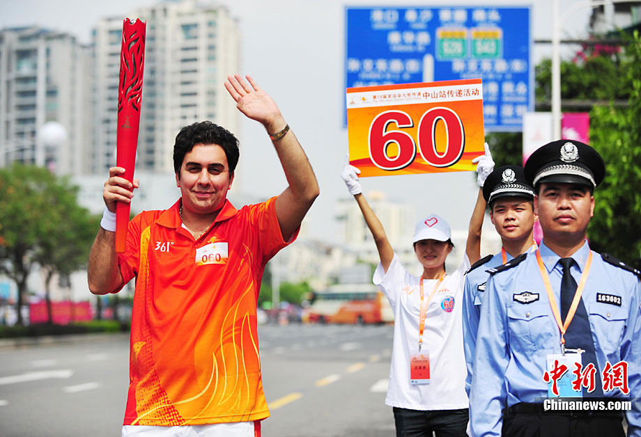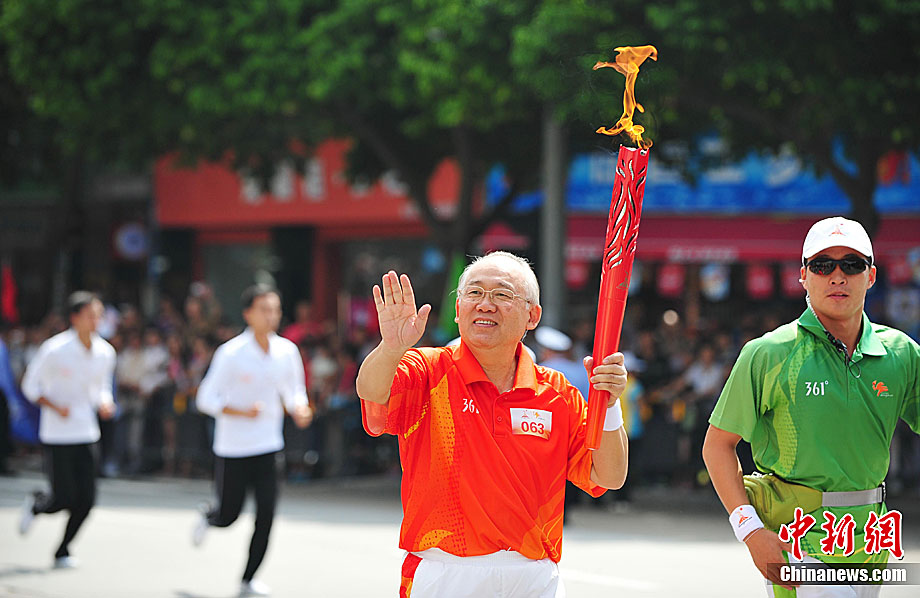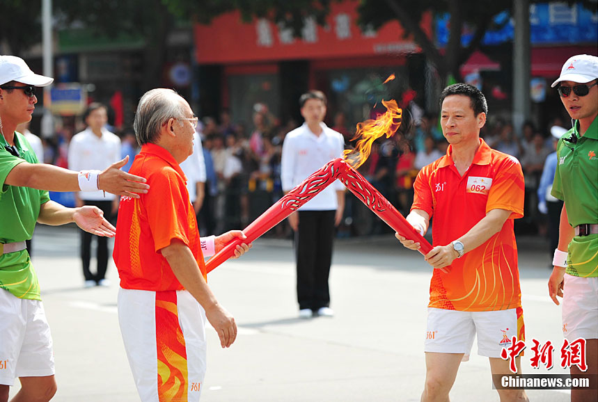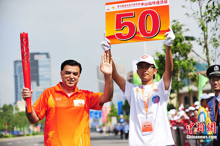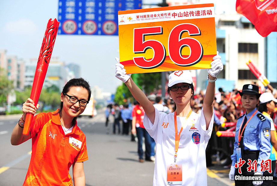 10月13日,備受矚目的第16屆廣州亞運會火炬?zhèn)鬟f在廣東省中山市舉行;鹁?zhèn)鬟f從孫文紀念公園出發(fā),火炬手有科學家、音樂家、漫畫家、美術家、企業(yè)家等80名火炬手接力,全長11.2公里。中新社記者 陳文 攝