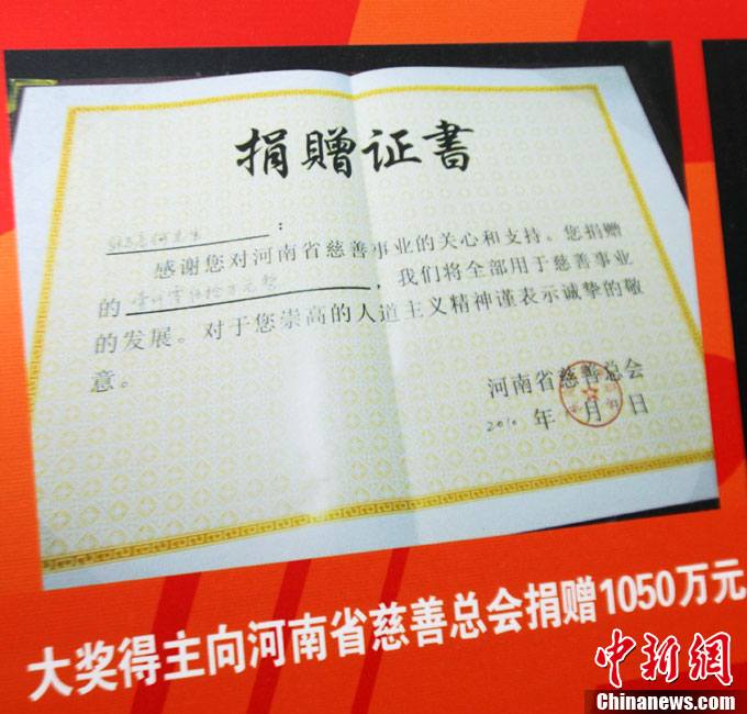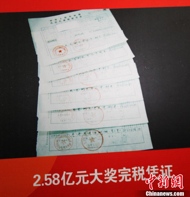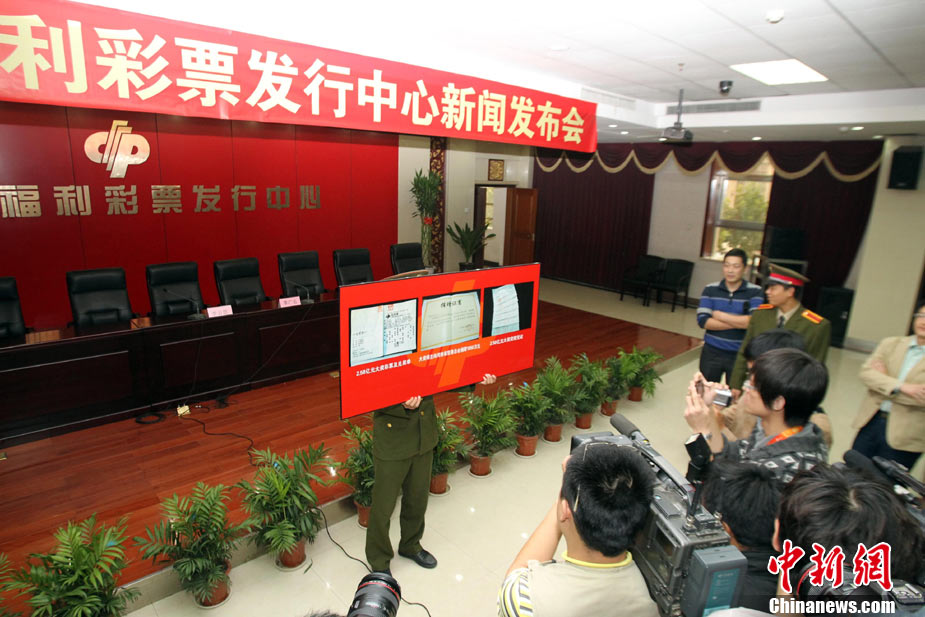 10月13日,河南福彩中心召開新聞發(fā)布會通報雙色球2.58億兌獎情況,2.58億巨獎彩票在發(fā)布會上曝光。巨獎于本周一被兌取,得主是一位長期從事教育職業(yè)的駐馬店本地人,他的大獎為機選1注后50倍投,他將捐款1050萬,為目前中國彩市大獎得主單筆最高捐款。2.58億是繼2009年安陽彩民獲3.59億后,河南彩民攬獲的又一個超級巨獎。中新社記者 王中舉 攝