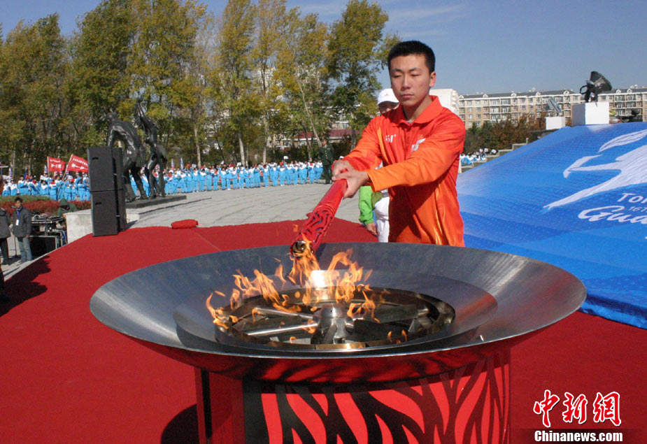 10月15日,第16屆廣州亞運(yùn)會(huì)火炬在吉林省長(zhǎng)春市進(jìn)行展示性傳遞,這是本屆亞運(yùn)會(huì)火炬?zhèn)鬟f在廣東省外的第二站。16名火炬手在長(zhǎng)春世界雕塑公園沿公園北側(cè)環(huán)路完成16棒傳遞,5000余名熱情的長(zhǎng)春市民現(xiàn)場(chǎng)見(jiàn)證了這一時(shí)刻。圖為最后一棒火炬手點(diǎn)燃圣火盆。中新社發(fā) 田偉 攝