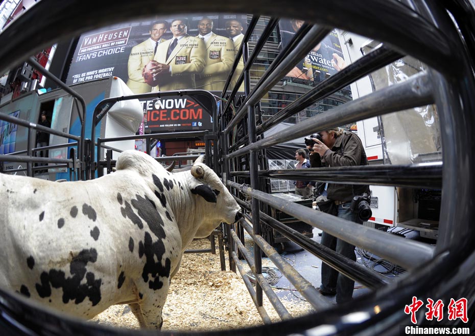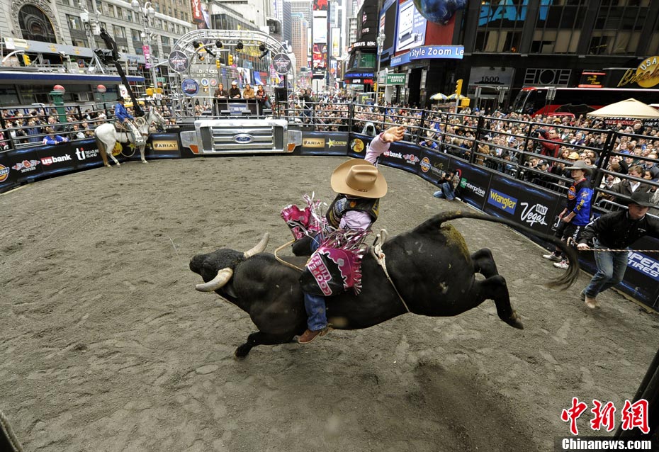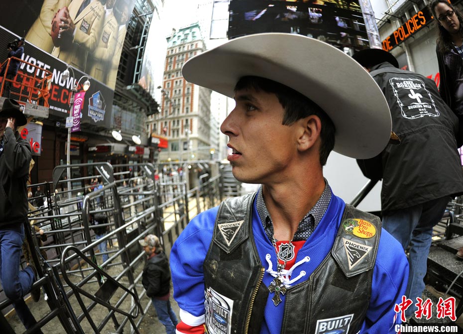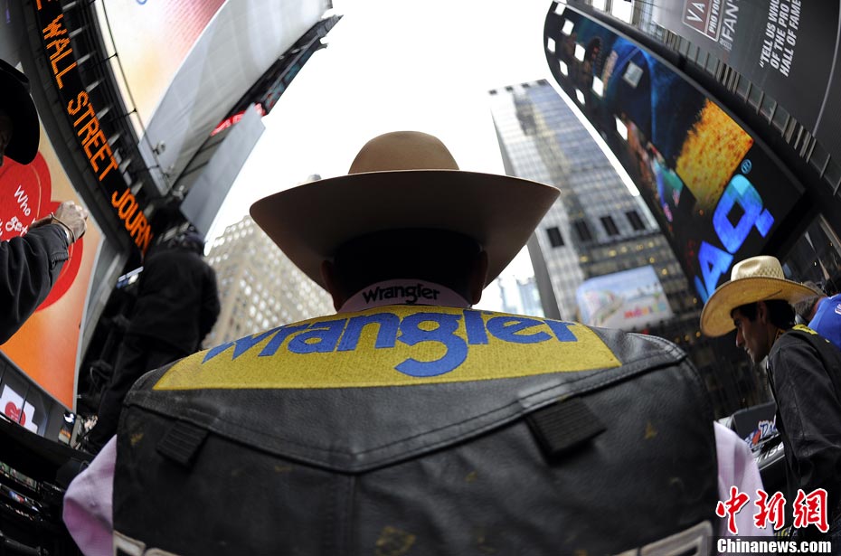 當(dāng)?shù)貢r間10月15日,10名美國職業(yè)騎牛大賽的頂尖選手在紐約時報廣場上演了一場精彩的騎牛大賽,為將于10月20日至24日在美國拉斯維加斯舉行的2010職業(yè)騎?倹Q賽造勢。