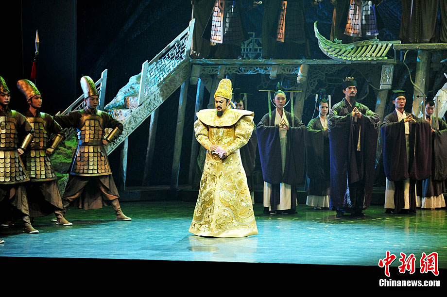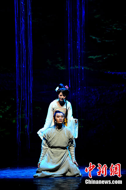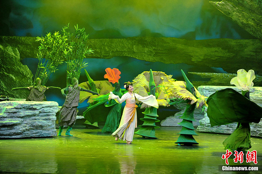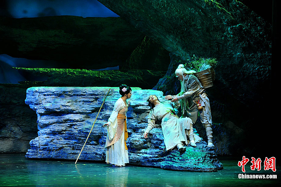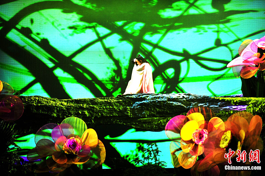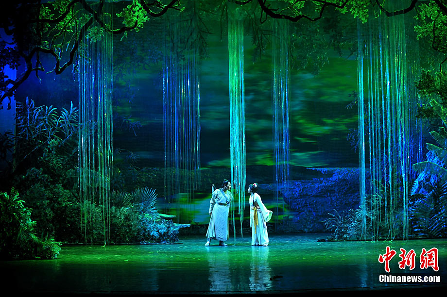 10月16日晚,匯集了中國內(nèi)地頂級音樂劇創(chuàng)作團隊集體智慧的大型原創(chuàng)多媒體音樂劇《青城》在成都錦城藝術(shù)宮舉行全球首演。該劇以青城山傳統(tǒng)道教文化為精神內(nèi)核,以成都市唯一的世界自然文化雙遺產(chǎn)地“青城山—都江堰”作為劇情發(fā)展“舞臺”,是全球“首部道文化多媒體音樂劇”,也是象征成都市都江堰災后文化重建、人性重建、精神重建的文化作品。圖為《青城》劇照。中新社發(fā) 安源 攝