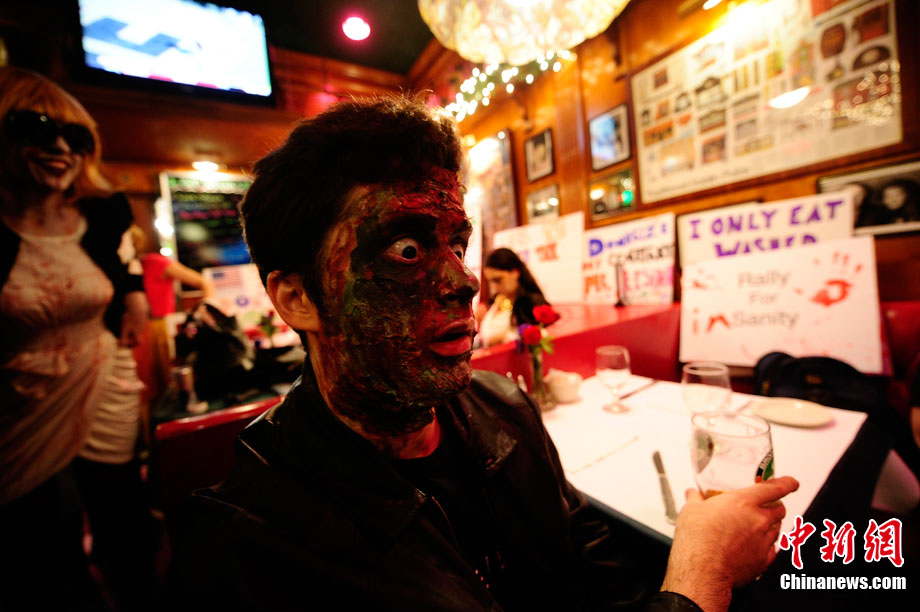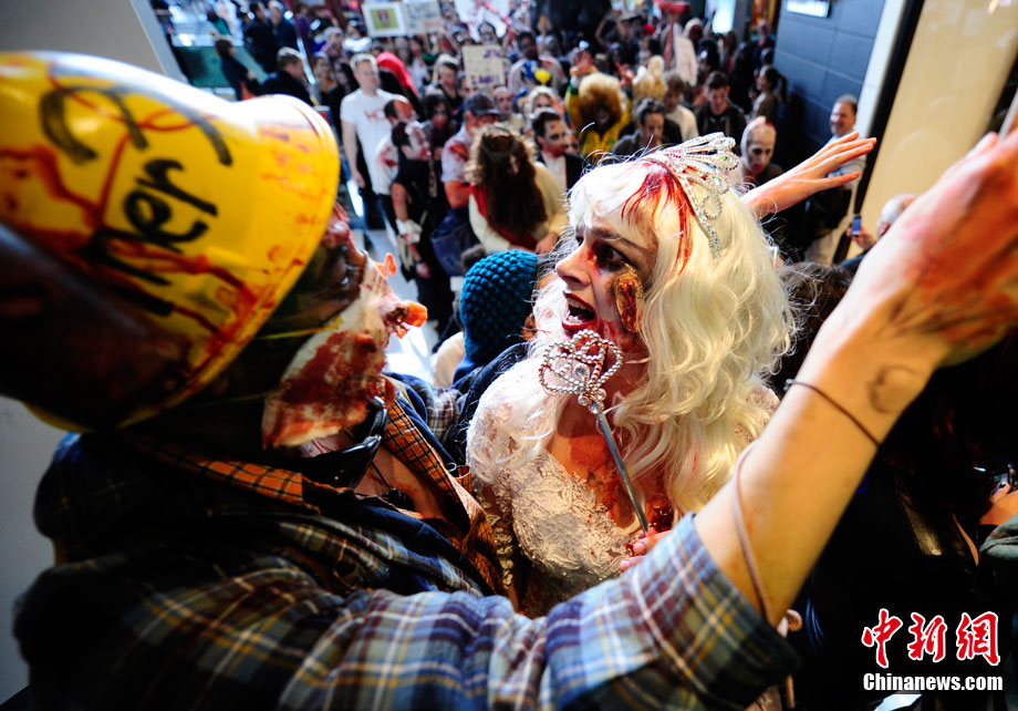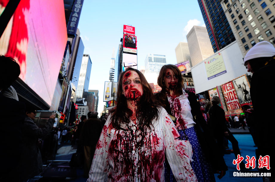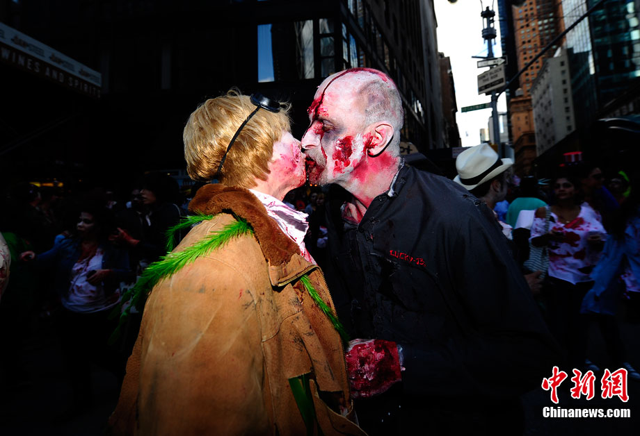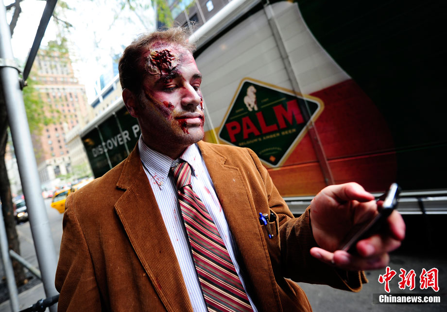 當(dāng)?shù)貢r(shí)間10月16日,美國紐約曼哈頓舉行了盛大的僵尸大游行。數(shù)百名狂歡者將自己打扮成僵尸模樣嚇唬路上的民眾。