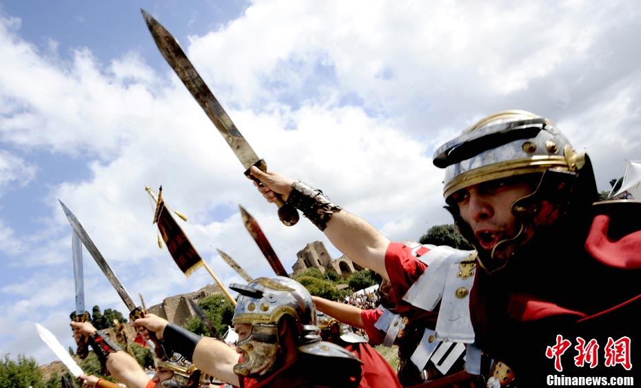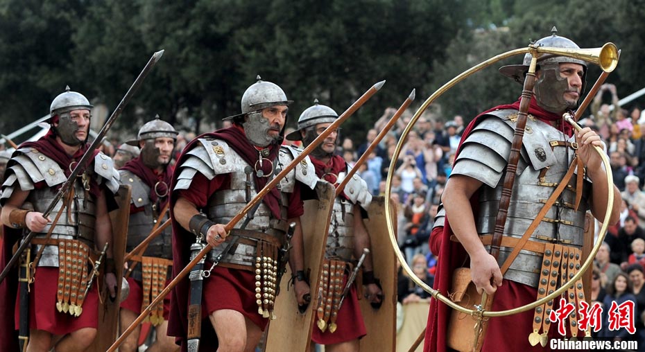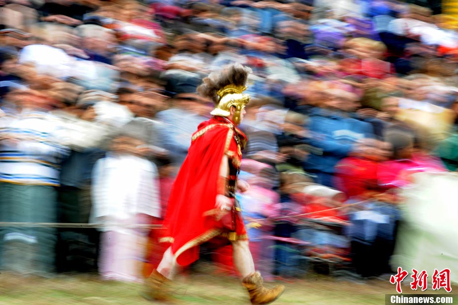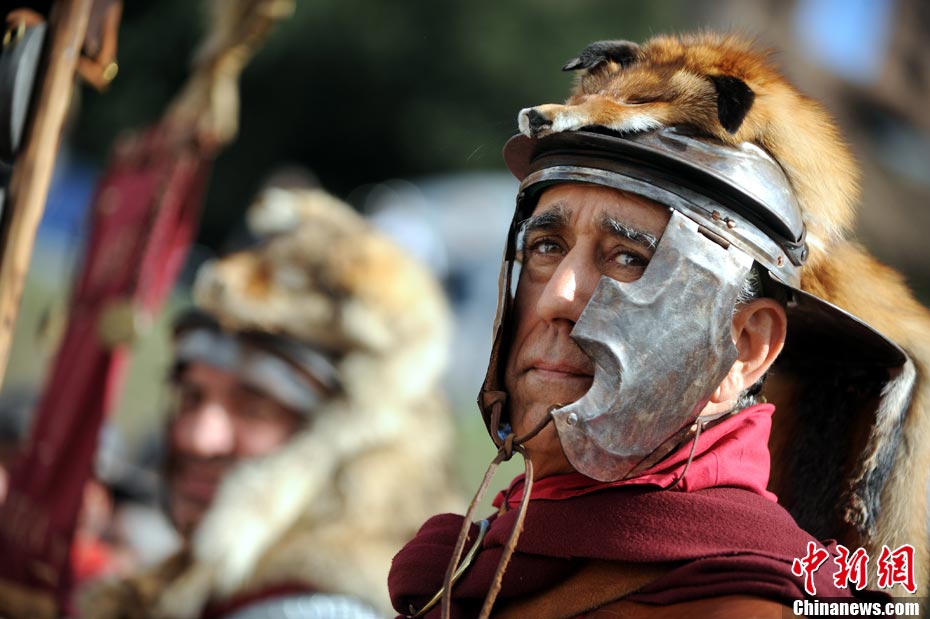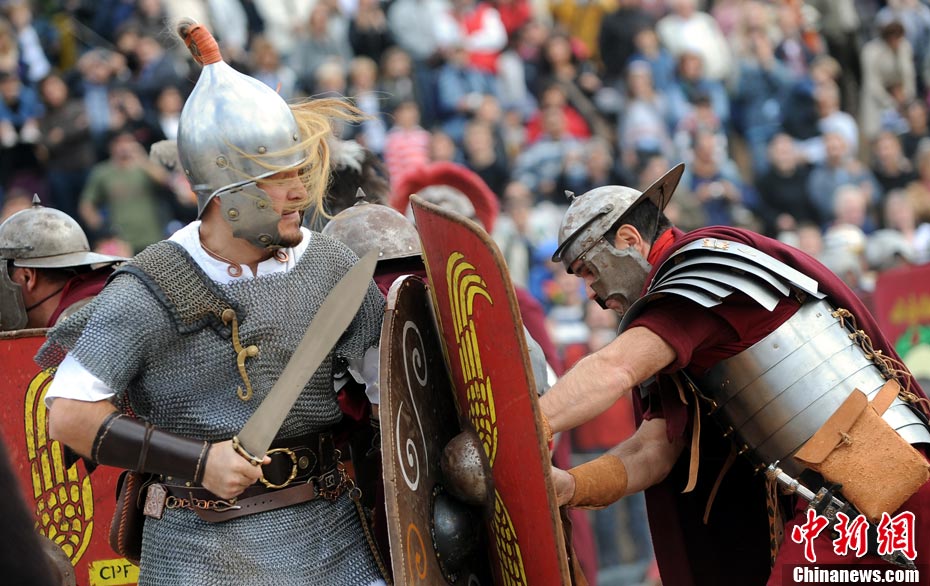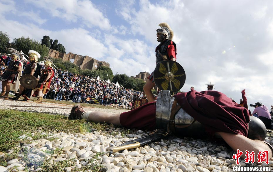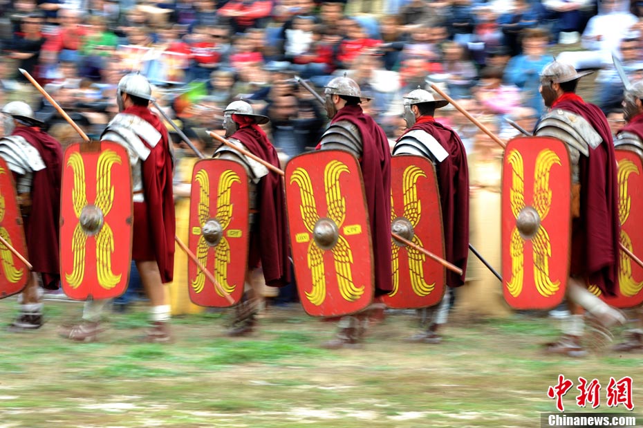 當(dāng)?shù)貢r(shí)間2010年10月17日,意大利羅馬的歷史愛好者和演員們?cè)佻F(xiàn)了“古羅馬軍團(tuán)”和凱爾特人戰(zhàn)斗的場(chǎng)景,表演吸引了大批觀眾到場(chǎng)觀看。