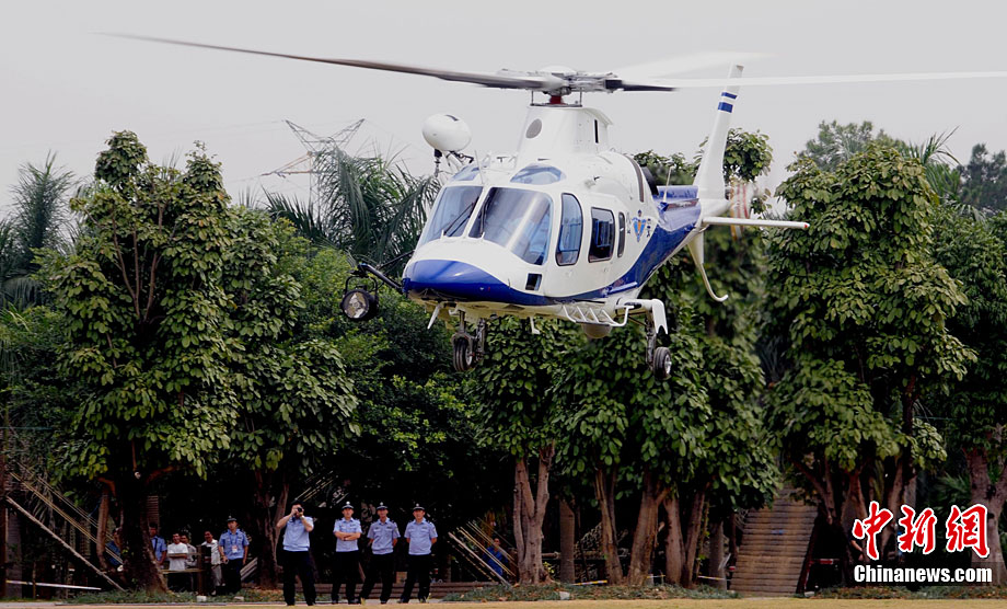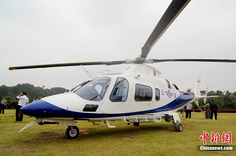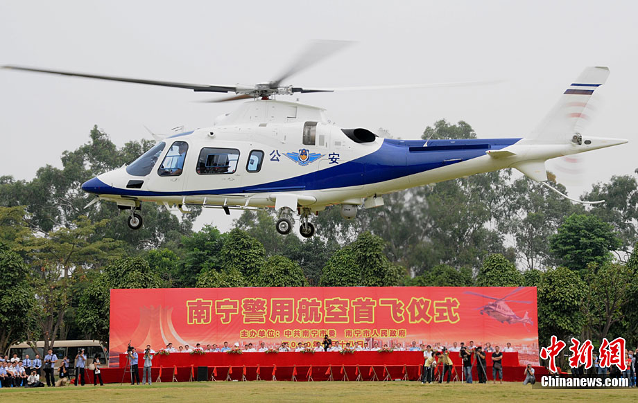 10月18日,南寧警用直升機首飛儀式在南寧青秀山舉行,這是南寧首架也是中國西南首架警用直升機。該機最大速度每小時311千米,最大航程是977千米,最大起飛重量是3000千克,駕駛艙可乘坐2名飛行員,客艙內(nèi)放置有一個工作臺和5個乘客座椅,續(xù)航時間為4小時,是意大利阿古斯特-韋斯特蘭公司生產(chǎn)的A109E輕型雙發(fā)直升機。據(jù)悉,這是據(jù)廣州、北京、上海后,第四個擁有警用直升機的城市。圖片來源:cnsphoto loniya 攝