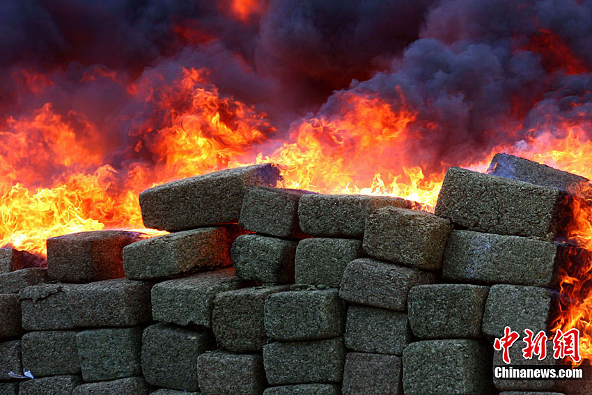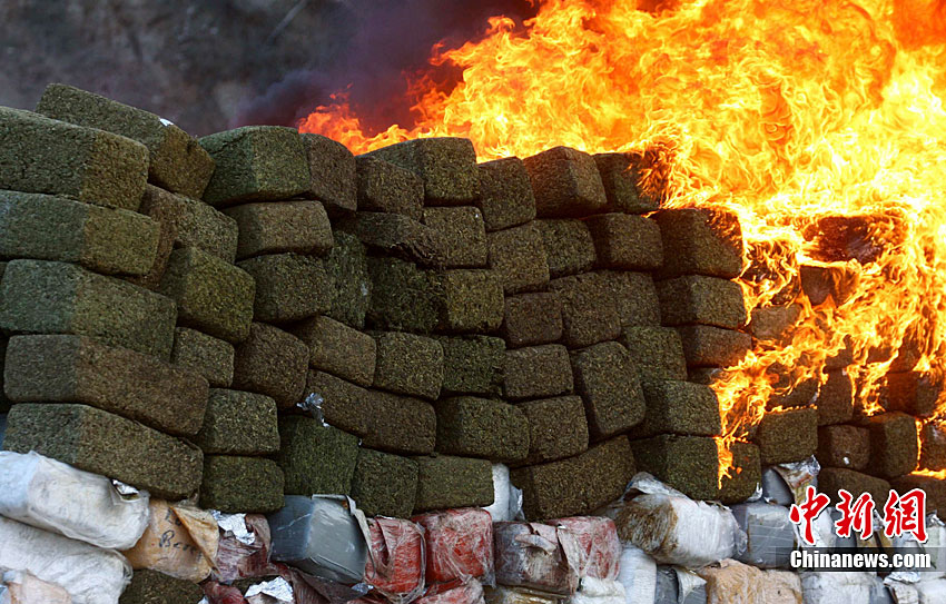 當(dāng)?shù)貢r(shí)間10月20日,墨西哥在北部邊境城市蒂華納的一個(gè)軍營(yíng)內(nèi)集中銷毀了在北部邊境繳獲的134噸大麻。