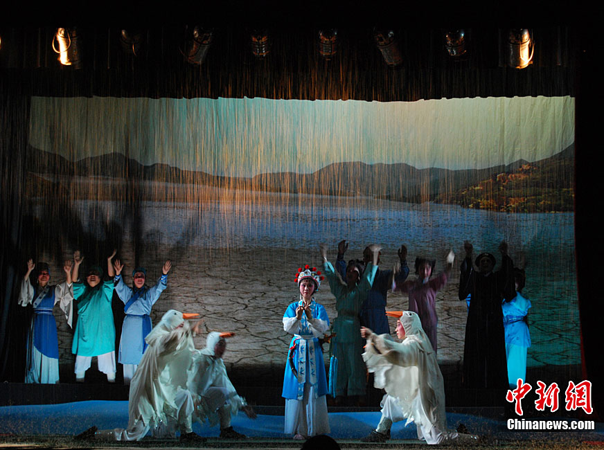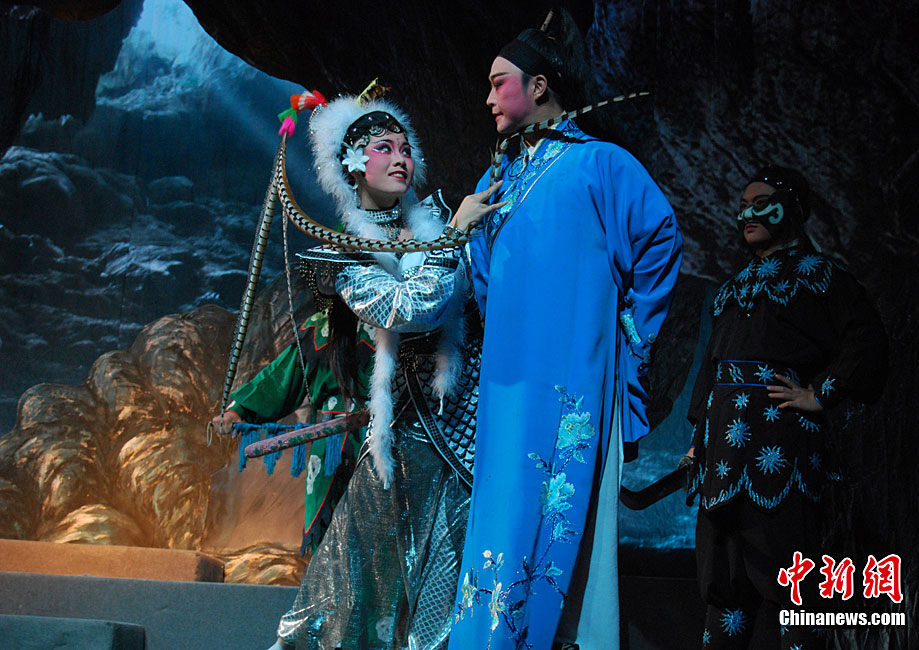 10月22日晚,中國首屆臨水夫人陳靖姑文化學(xué)術(shù)研討會獻(xiàn)演劇目,大型神話閩劇《臨水夫人陳靖姑》在陳靖姑祖廟所在地——福建古田精彩上演。該劇由古田縣閩劇團(tuán)演出,共有《陳靖姑出世》、《蛇鬼禍害》、《延婚離家》、《結(jié)義學(xué)法》、《婚禮劍影》、《蛇鬼陰謀》、《哭別嬰兒》、《閩江祈雨》、《得道臨水》、《天上人間》10個場次,講述了陳靖姑降妖除魔、救助婦孺的感人事跡。兩岸媽祖宮廟代表人和當(dāng)?shù)匦疟,共同觀看了此次演出。李松 攝