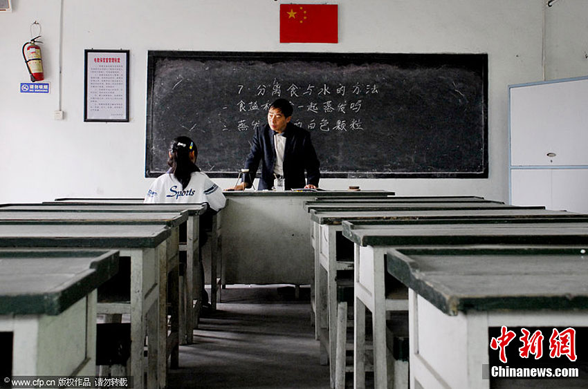 成都郫縣清水小學(xué)搬遷前夕,一位學(xué)生因家中搬遷原因未轉(zhuǎn)校,學(xué)校將為其授課到最后。她叫孫悅,讀4年級。每天早上8點多,她一個人來到學(xué)校,下午4點多,她又一個人回家。只有她的自行車,能一路陪著她。教室里,除了她只有老師。和孫悅一樣留守學(xué)校的,還有19名老師。老師們早上來到學(xué)校的第一件事,是打掃衛(wèi)生。原來由一個班負責(zé)的公共區(qū)域,現(xiàn)在完全由老師來負責(zé)。位于成都郫縣德源鎮(zhèn)勝利村的清水小學(xué),全校目前只有1個學(xué)生在校讀書,老師仍按照原定課表,為其上課。這種類似“家教一對一式”的教學(xué)方式,已整整持續(xù)了一周。圖片來源:CFP視覺中國
