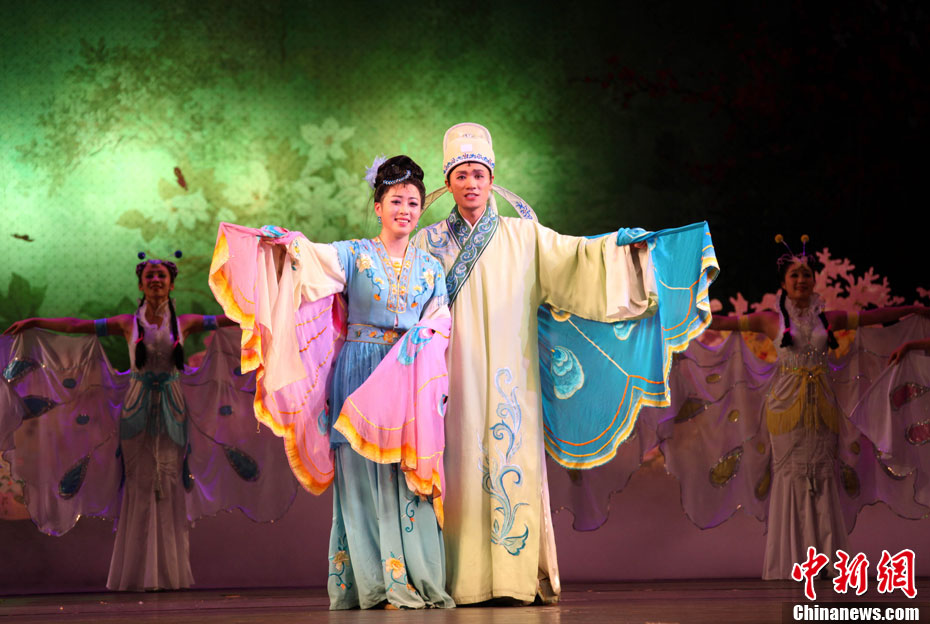 10月24日下午,朝鮮平壤大劇場上演其新排演的歌劇《梁山伯與祝英臺》。為紀(jì)念中國人民志愿軍赴朝參戰(zhàn)60周年,朝鮮血海歌劇團(tuán)把中國民間傳說《梁山伯與祝英臺》改編成歌劇。圖為該歌劇中“梁;钡木势。中新社發(fā) 孫自法 攝