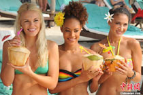 10月25日,參加正在海南三亞舉行的第60屆世界小姐總決賽的各國佳麗,在被譽(yù)為“天下第一灣”的三亞亞龍灣上演了一場“沙灘秀”,各國美女盡情享受三亞的陽光、海水和沙灘。中新社記者 尹海明 攝