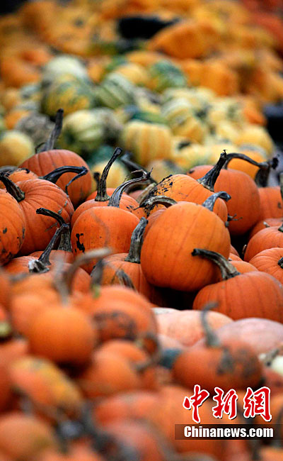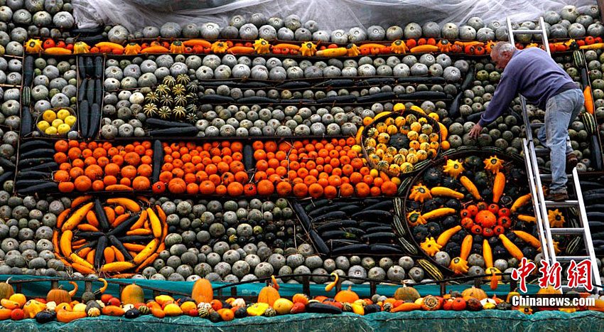 萬圣節(jié)到來的前夕,英國斯林登老農(nóng)托尼·史密斯將自己種植數(shù)百只南瓜堆成牽引機(jī)車的模型。