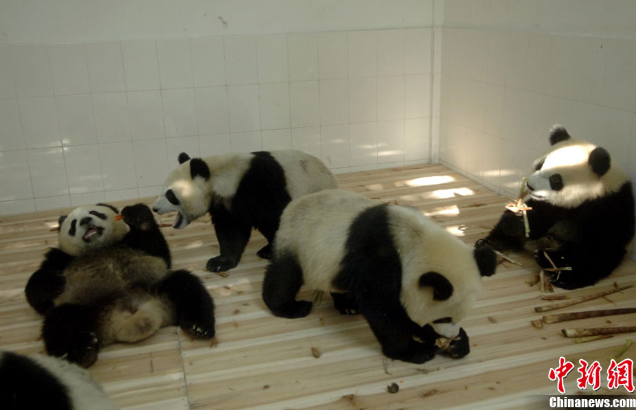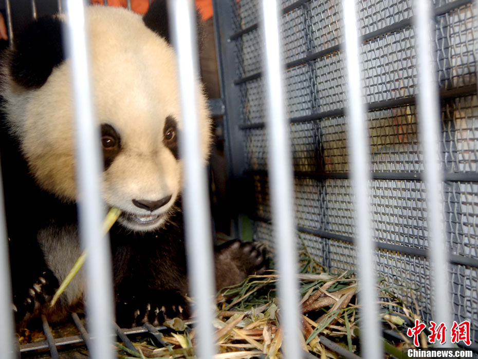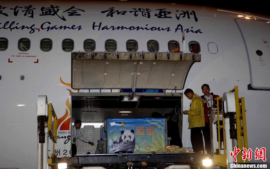 10月27日晚,6只出生于四川臥龍保護(hù)大熊貓研究中心的大熊貓乘“亞運(yùn)號”專機(jī)抵達(dá)廣州,落戶香江野生動(dòng)物世界,與動(dòng)物園現(xiàn)有6只大熊貓共同組成“亞運(yùn)熊貓團(tuán)”,為下月在廣州舉行的第16屆亞運(yùn)會(huì)助威。中新社發(fā) 劉衛(wèi)勇 攝
