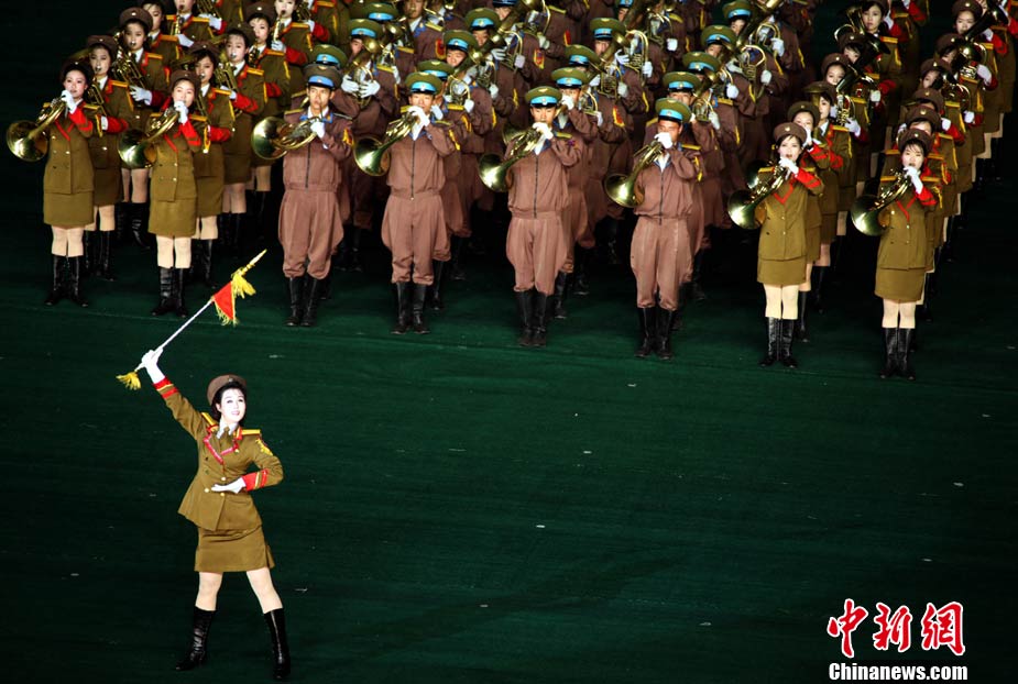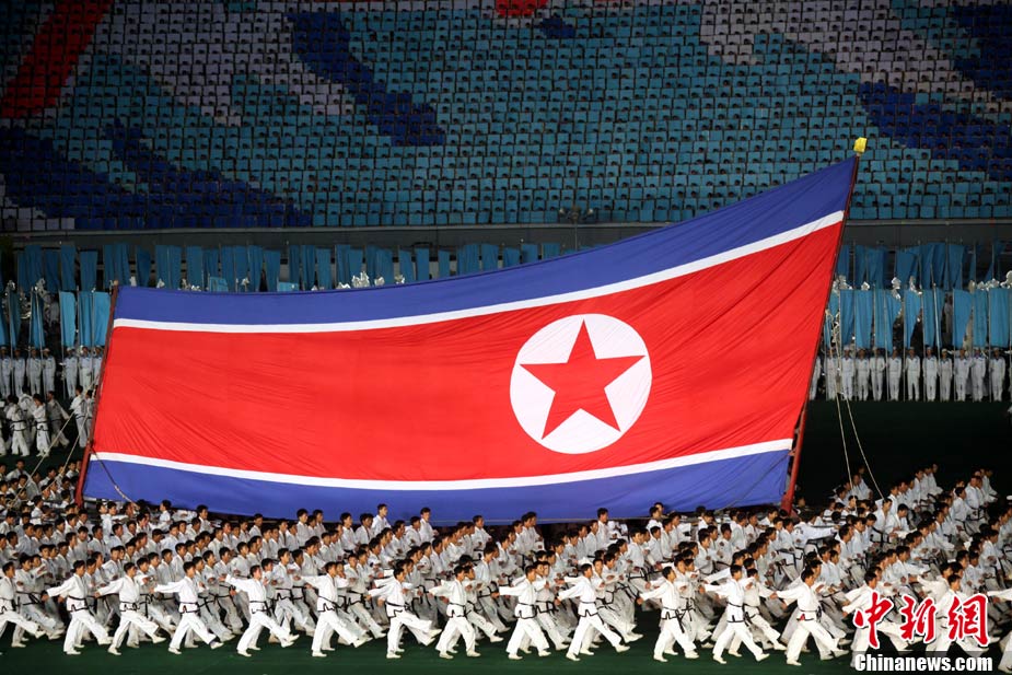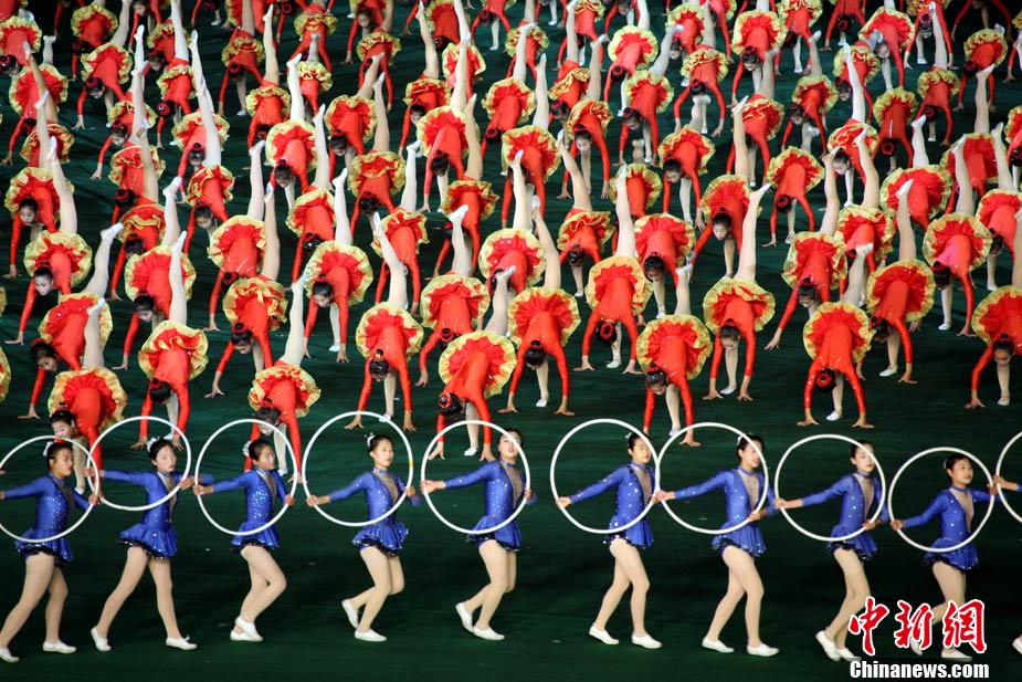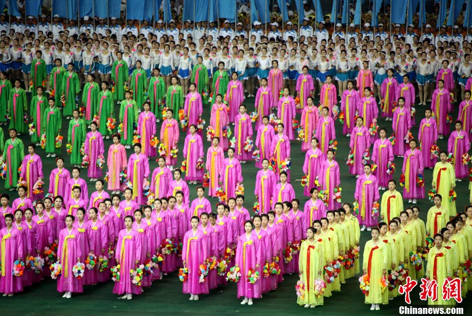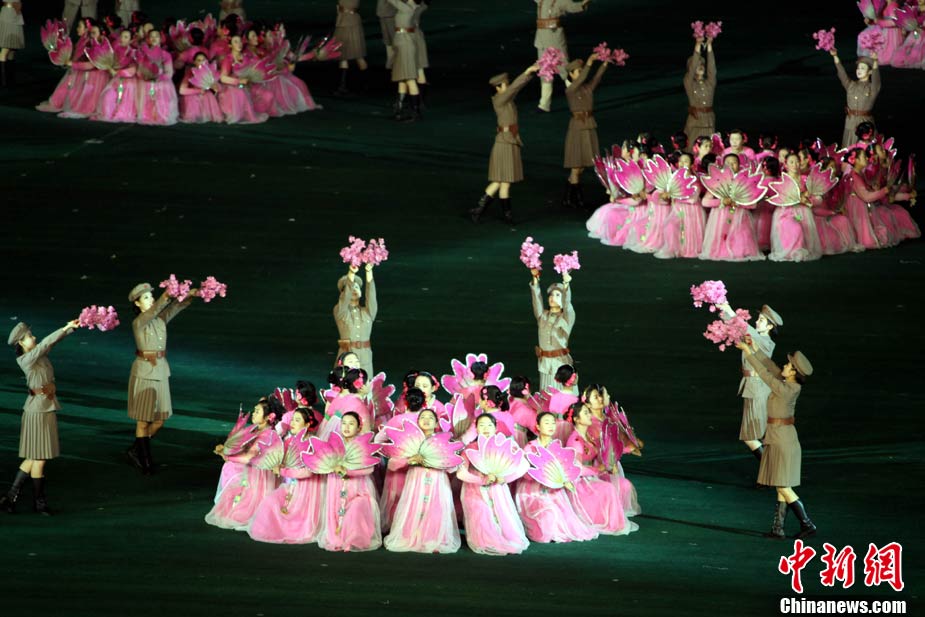 10月23日,朝鮮在平壤“五一”體育場為紀念中國人民志愿軍入朝參戰(zhàn)60周年舉辦大型團體操和藝術表演《阿里郎》。 中新社記者 孫自法 攝