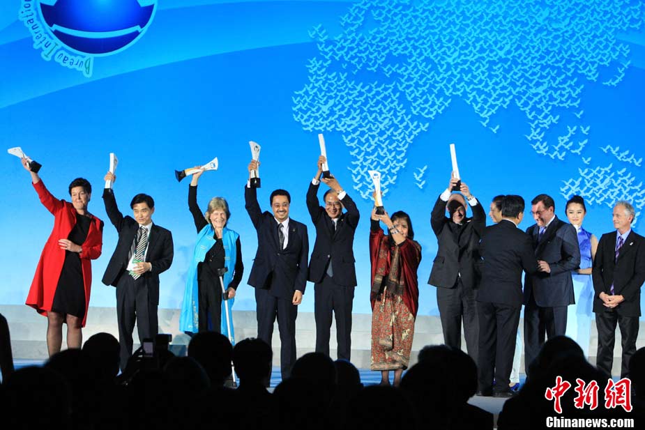 10月30日晚,上海世博會(huì)舉行頒獎(jiǎng)晚會(huì),頒發(fā)“世博會(huì)獎(jiǎng)”、“COSMOS”獎(jiǎng)、“國(guó)展局獎(jiǎng)?wù)隆。“世博?huì)獎(jiǎng)”分為ABCD四類(lèi)展館和金銀銅等次以及展館設(shè)計(jì)獎(jiǎng)、創(chuàng)意展示獎(jiǎng)、主題演繹獎(jiǎng)。圖為英國(guó)、韓國(guó)、西班牙分別獲得A類(lèi)展館設(shè)計(jì)獎(jiǎng)金銀銅;沙特、日本、馬來(lái)西亞分別獲得創(chuàng)意展示獎(jiǎng)金銀銅;德國(guó)、俄羅斯、法國(guó)分別獲得主題演繹獎(jiǎng)金銀銅。 中新社記者 潘索菲 攝