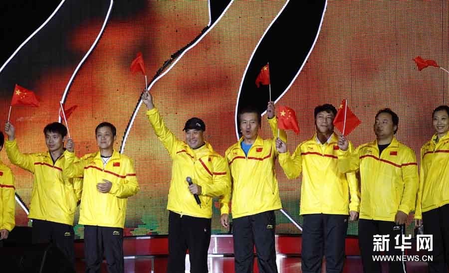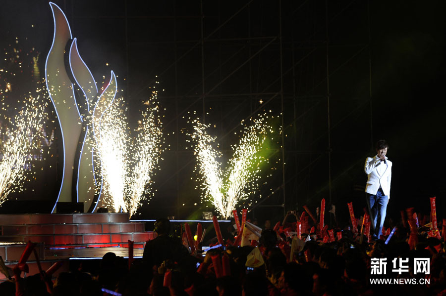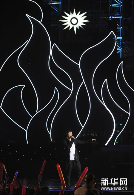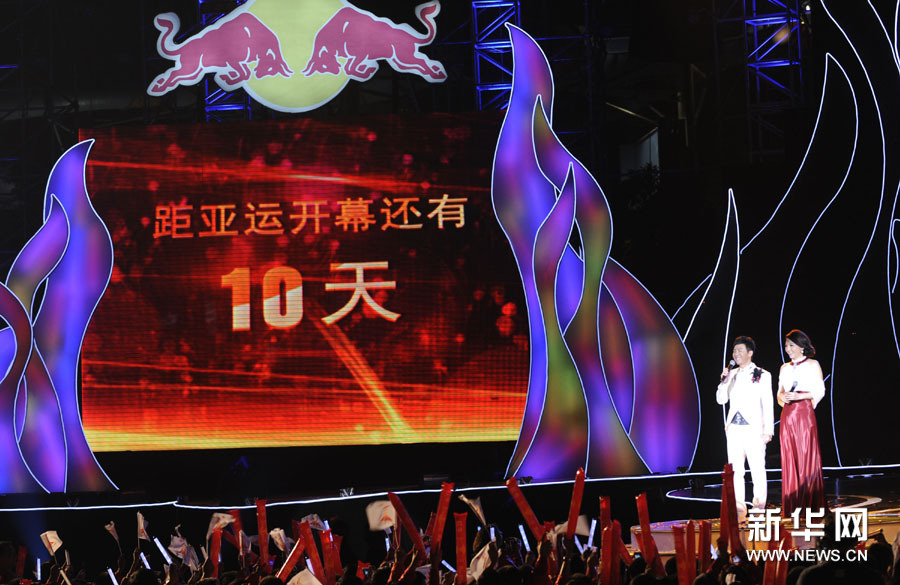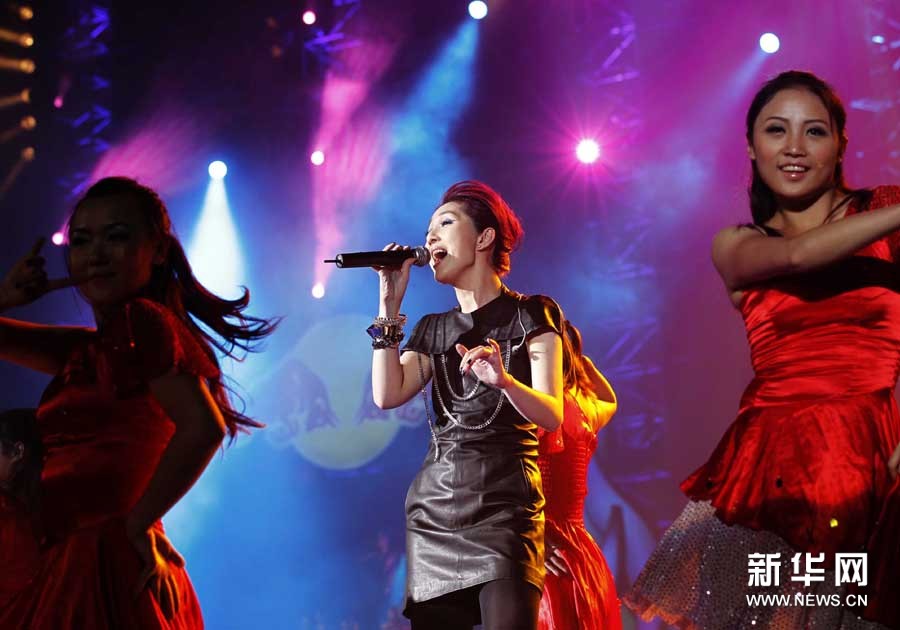 11月2日,歌手楊千嬅(中)在晚會上演唱。當(dāng)日,2010廣州亞運(yùn)會倒計時10天主題歌會在廣州舉行,來自內(nèi)地、香港的明星和中國羽毛球隊(duì)一起唱響激情亞運(yùn)。孟永民攝 圖片來源:新華網(wǎng)