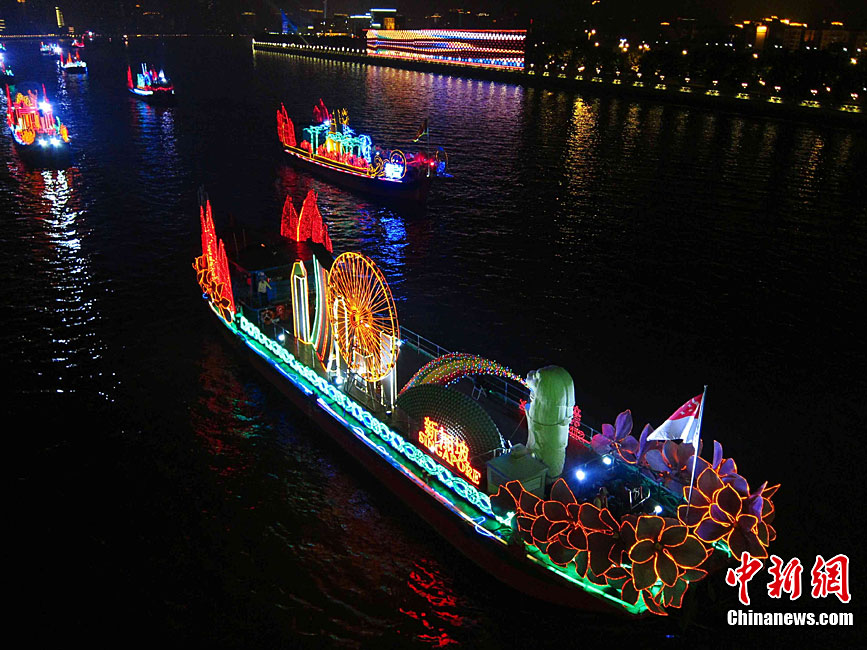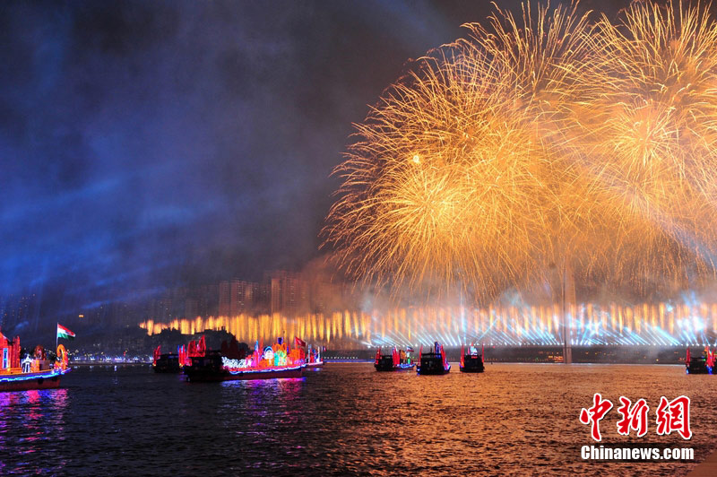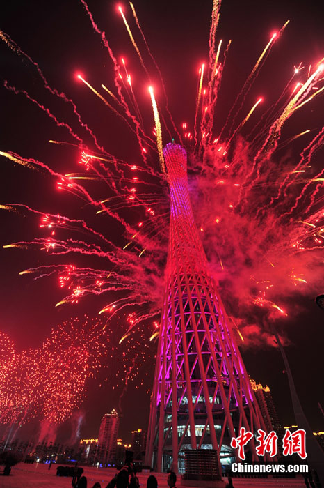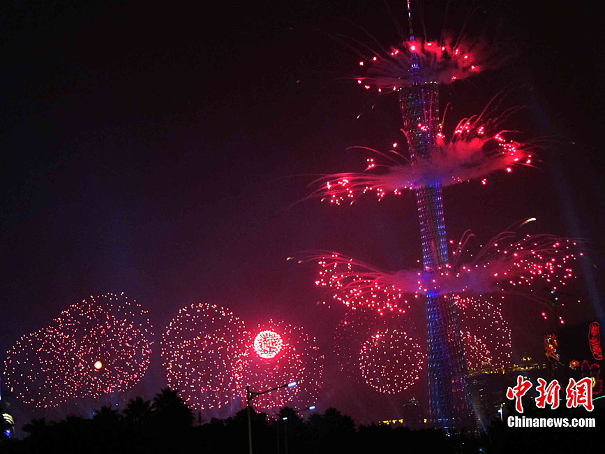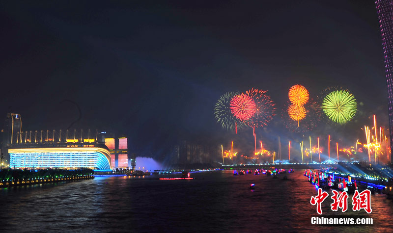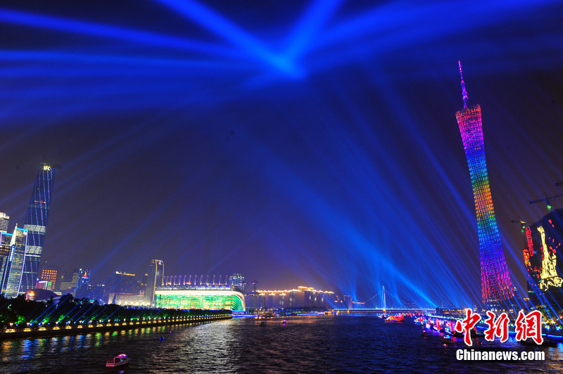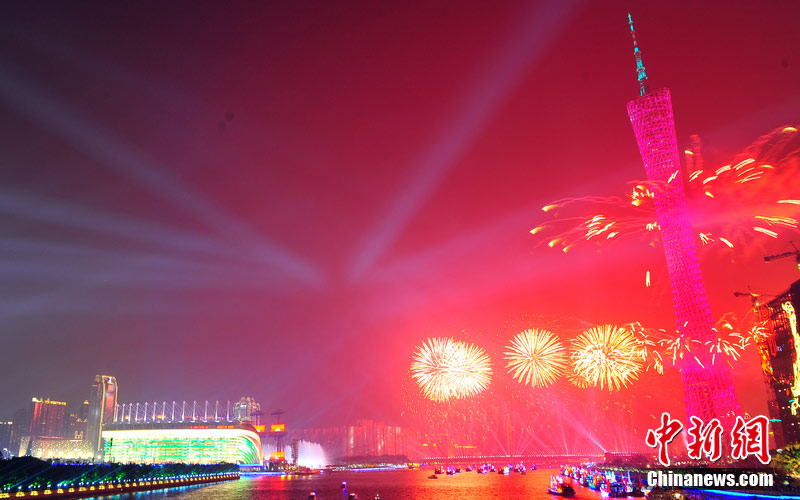 2010年11月3日晚,廣州海心沙上演包括煙花預(yù)演在內(nèi)的亞運(yùn)開幕式帶妝彩排。圖片來源:CFP視覺中國(guó)