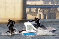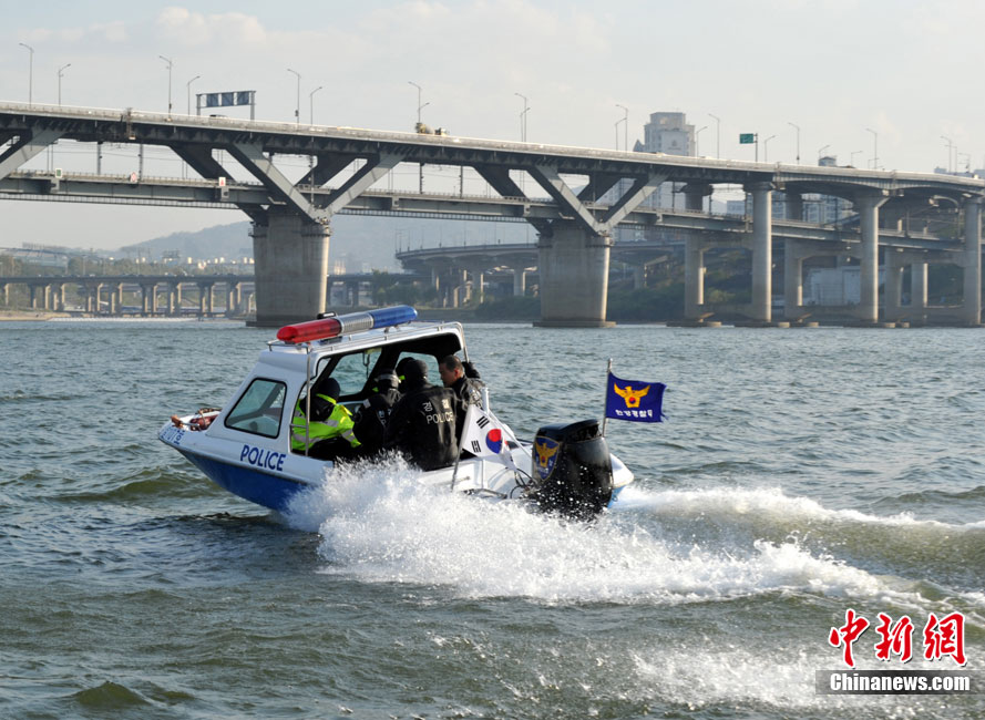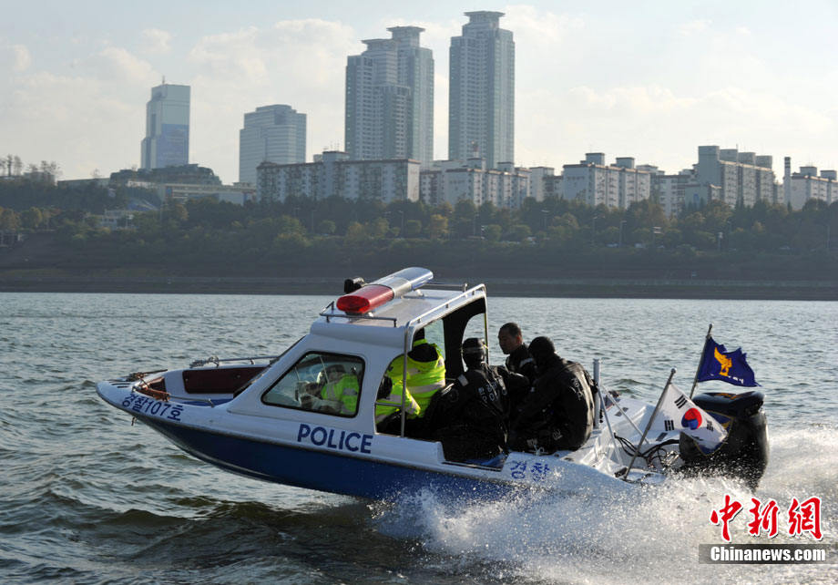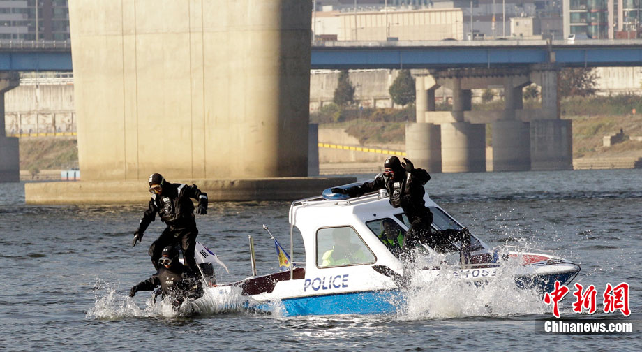 當(dāng)?shù)貢r間11月3日,韓國首爾附近的漢江中韓國水警舉行了針對G20峰會安保工作的演練。