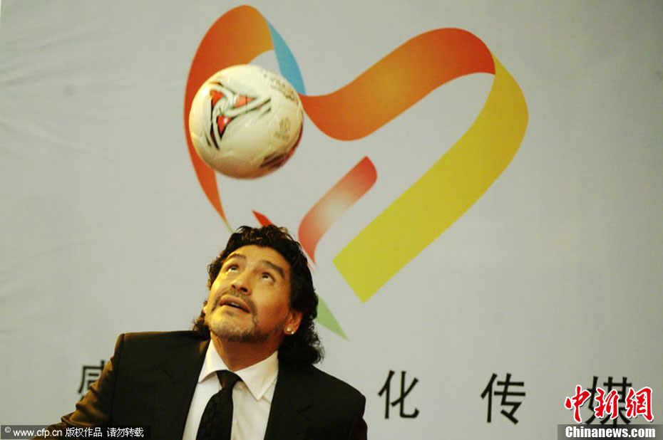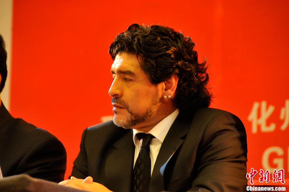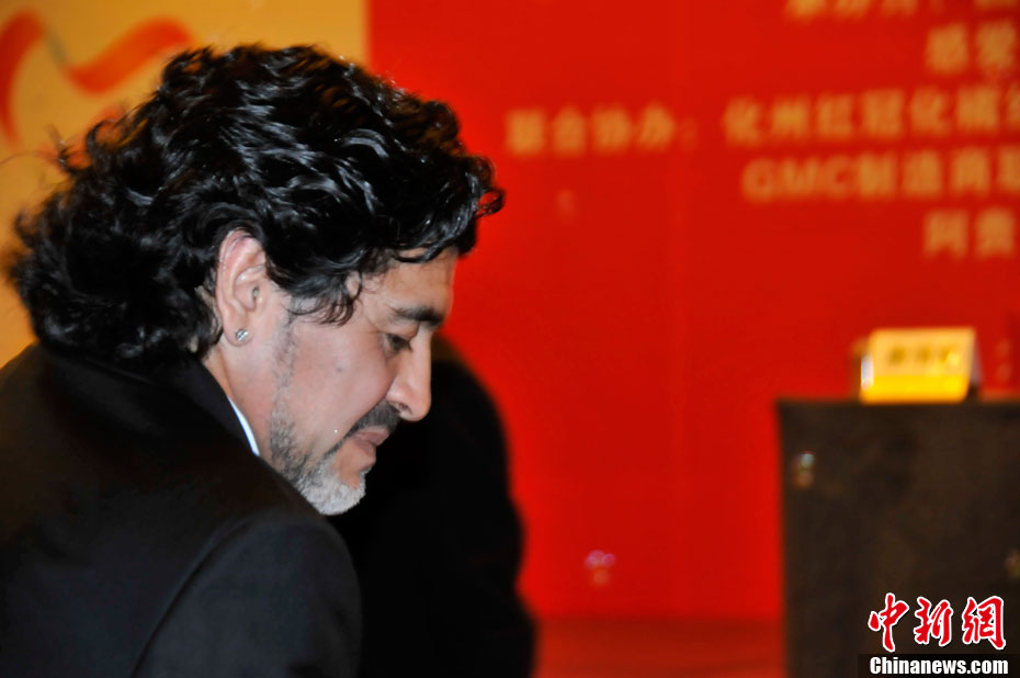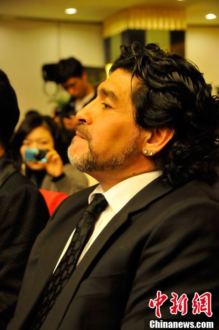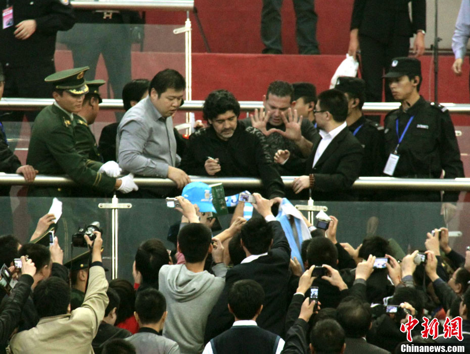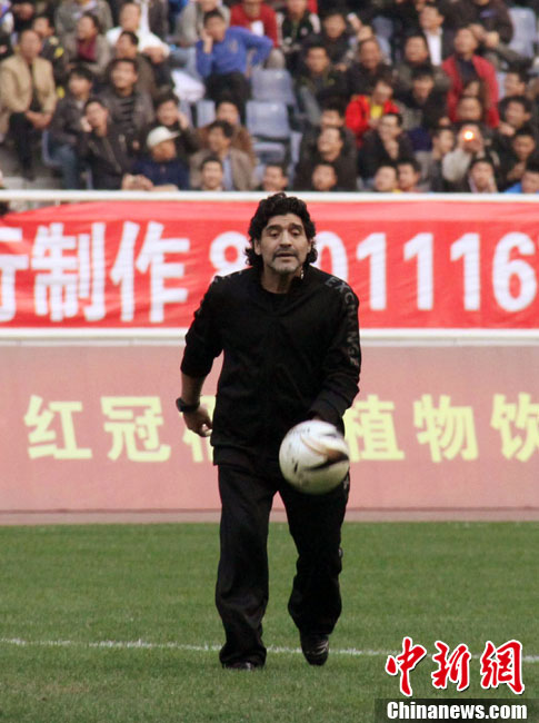 11月5日下午16時左右,世界球王馬拉多納來到山東濟南奧體中心參加山東聯(lián)隊與阿根廷明星隊的慈善比賽。圖為馬拉多納向現(xiàn)場的觀眾和球迷揮手致意。中新社發(fā) 牛杰峰 攝